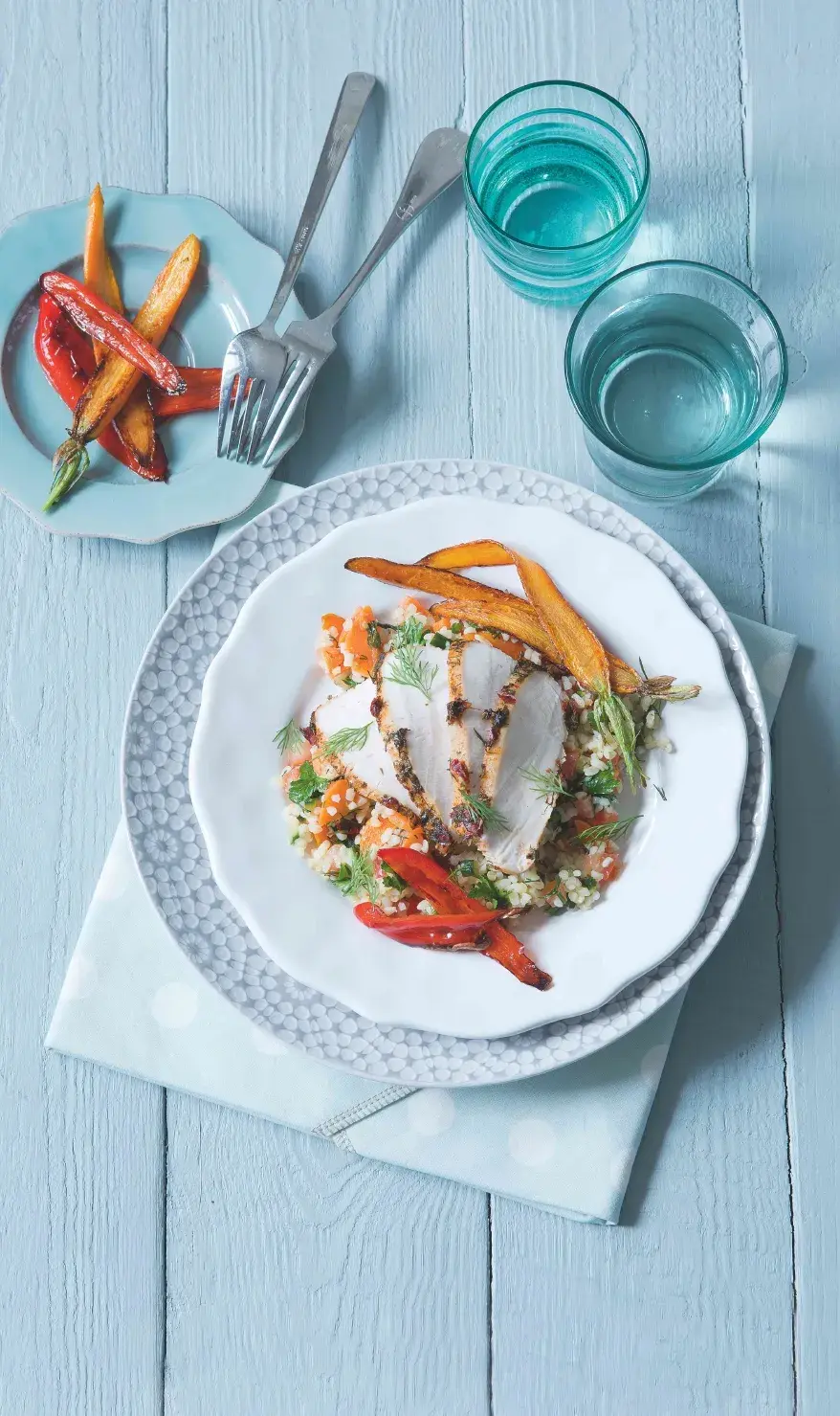 Pikantní pečené krůtí plátky, sladká glazovaná mrkvička a šťavnatý salát s bulgurem. Tahle kombinace je tak dobrá, až se nechce věřit, že je i zdravá! Krůtí prso v troubě připravíte raz dva a i zbytek je téměř bez práce. Přesvědčte se sami.