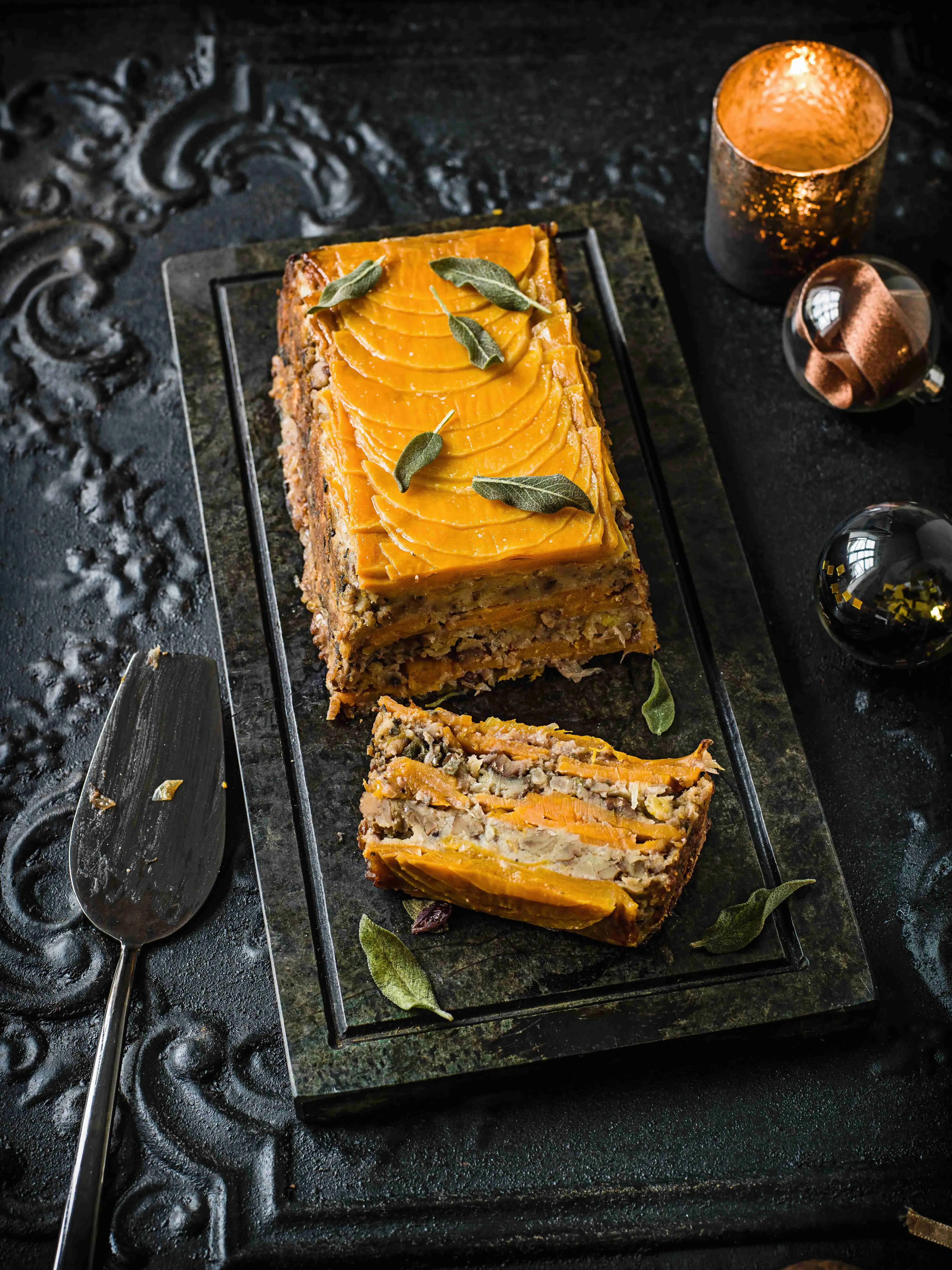 U terinek je vždy nejdůležitější prezentace, na skládání si proto dejte opravdu záležet. Pečlivost se projeví na krásném řezu. Výhodou je, že pečenou terinku s kaštany, batáty a dýní klidně můžete udělat den předem.