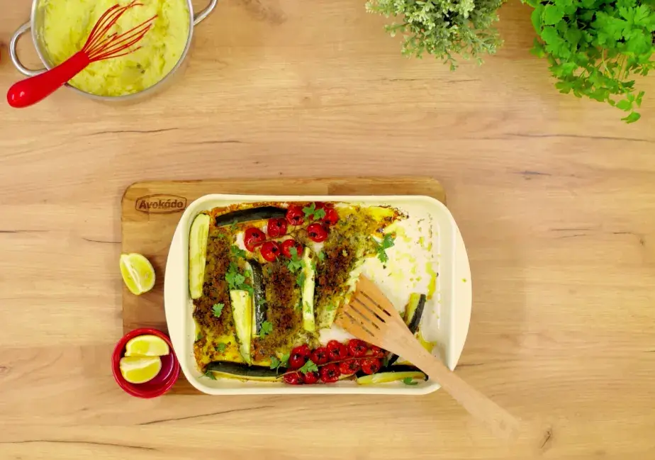 Zdravá večeře se sezonní zeleninou. Jemné rybí maso získá díky ochucené strouhance neuvěřitelný šmrnc! Pečená treska s kořeněnou krustou je senzační letní jídlo, plné chuti a jednoduché na přípravu.