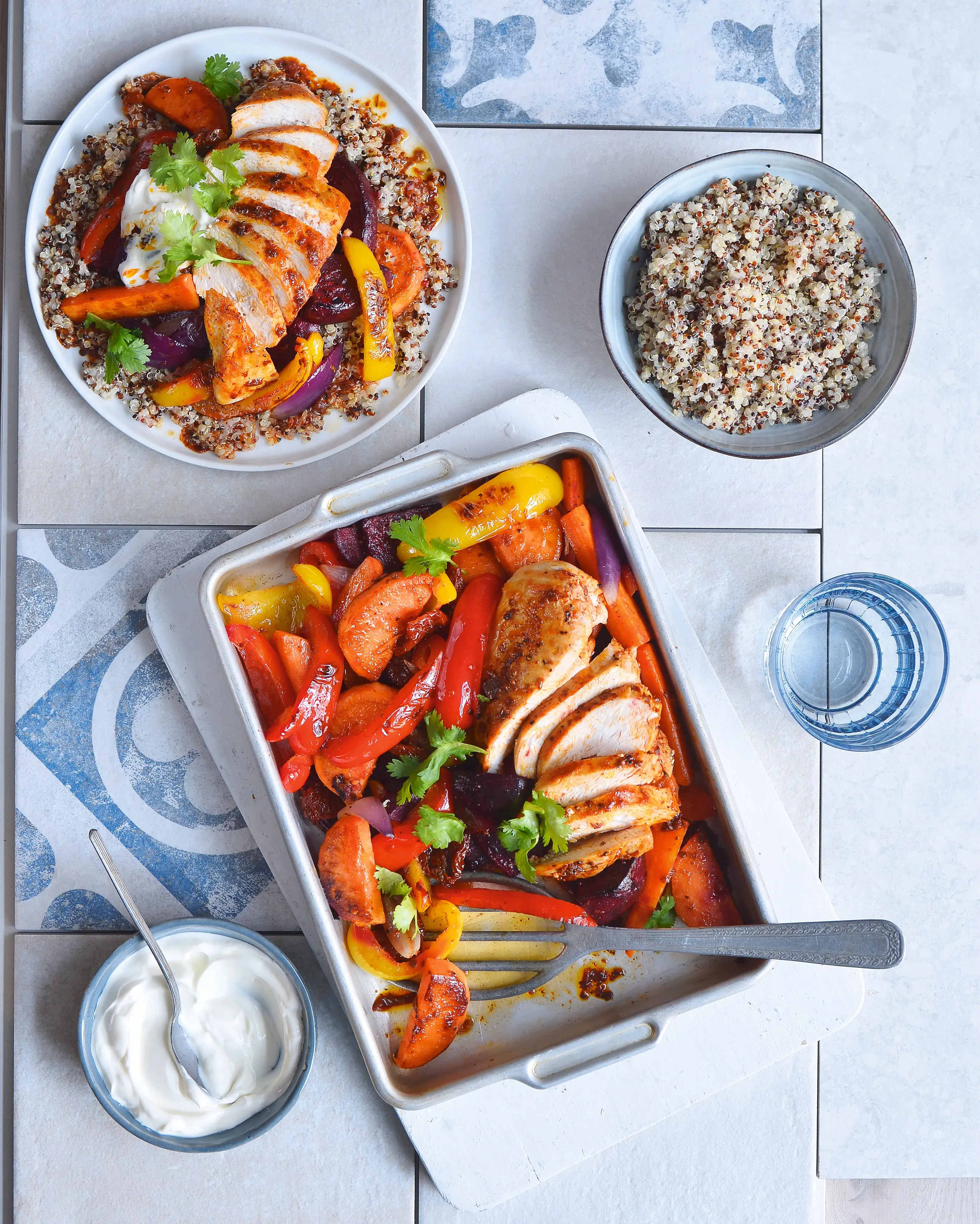 Pečená zelenina s kuřetem a quinoou je fantastické jídlo z jednoho pekáče. Není třeba žádných složitých úprav, stačí jen vše nakrájet a o většinu práce se postará trouba. Pokud uberete koření, můžete kuře se zeleninou a quinoou podávat i malým dětem. Uvidíte, že se po něm jen zapráší.