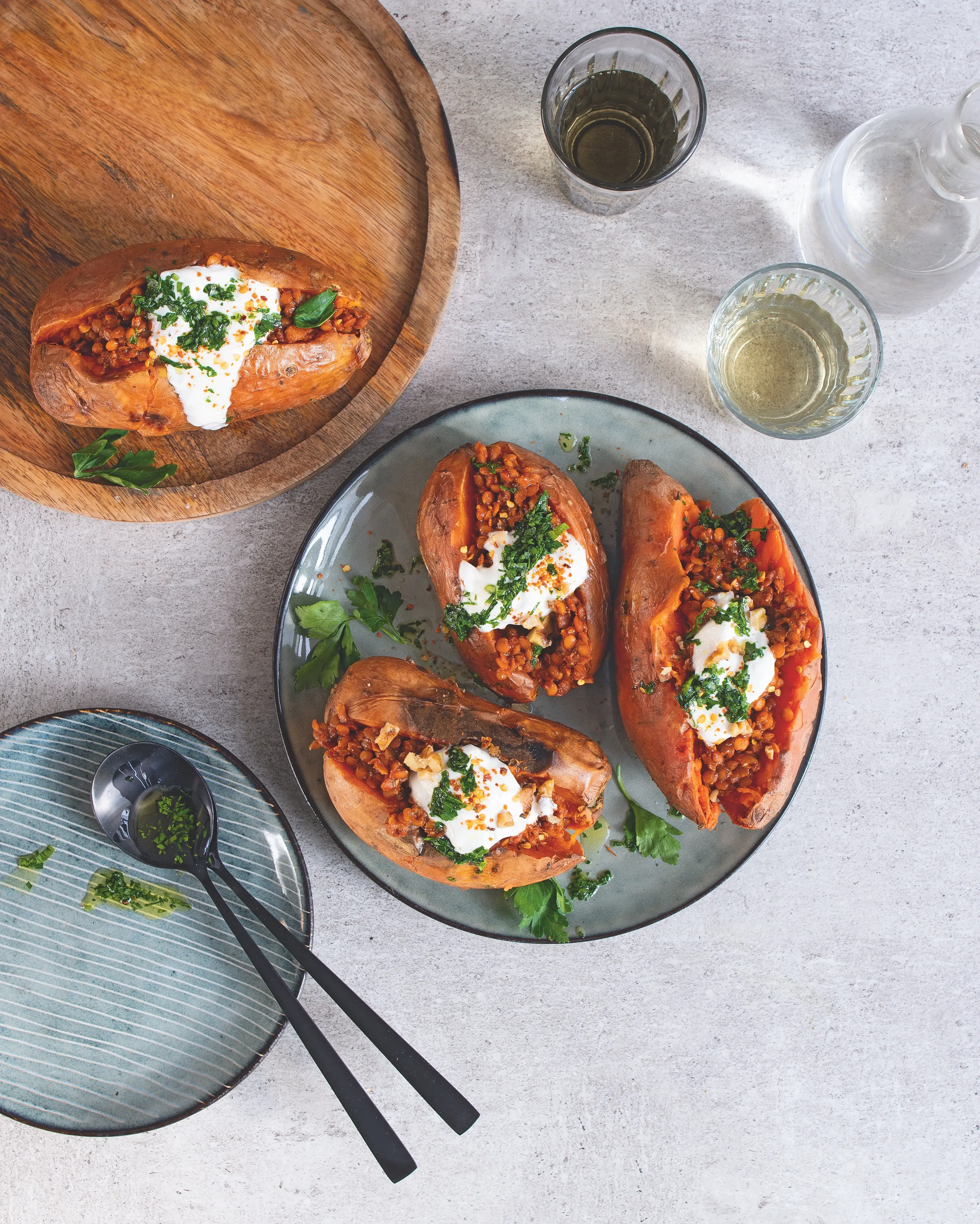 Pečené batáty plněné červenou čočkou jsou dokonalým zimním pokrmem pro celou rodinu. Sladké batáty se snoubí s bohatou, kořeněnou náplní, ve které hraje hlavní roli červená čočka, římský kmín a uzená paprika. Každé sousto zahřeje a dodá tělu dávku rostlinných bílkovin a vlákniny. Kopeček bílého jogurtu na závěr celé jídlo zjemní.