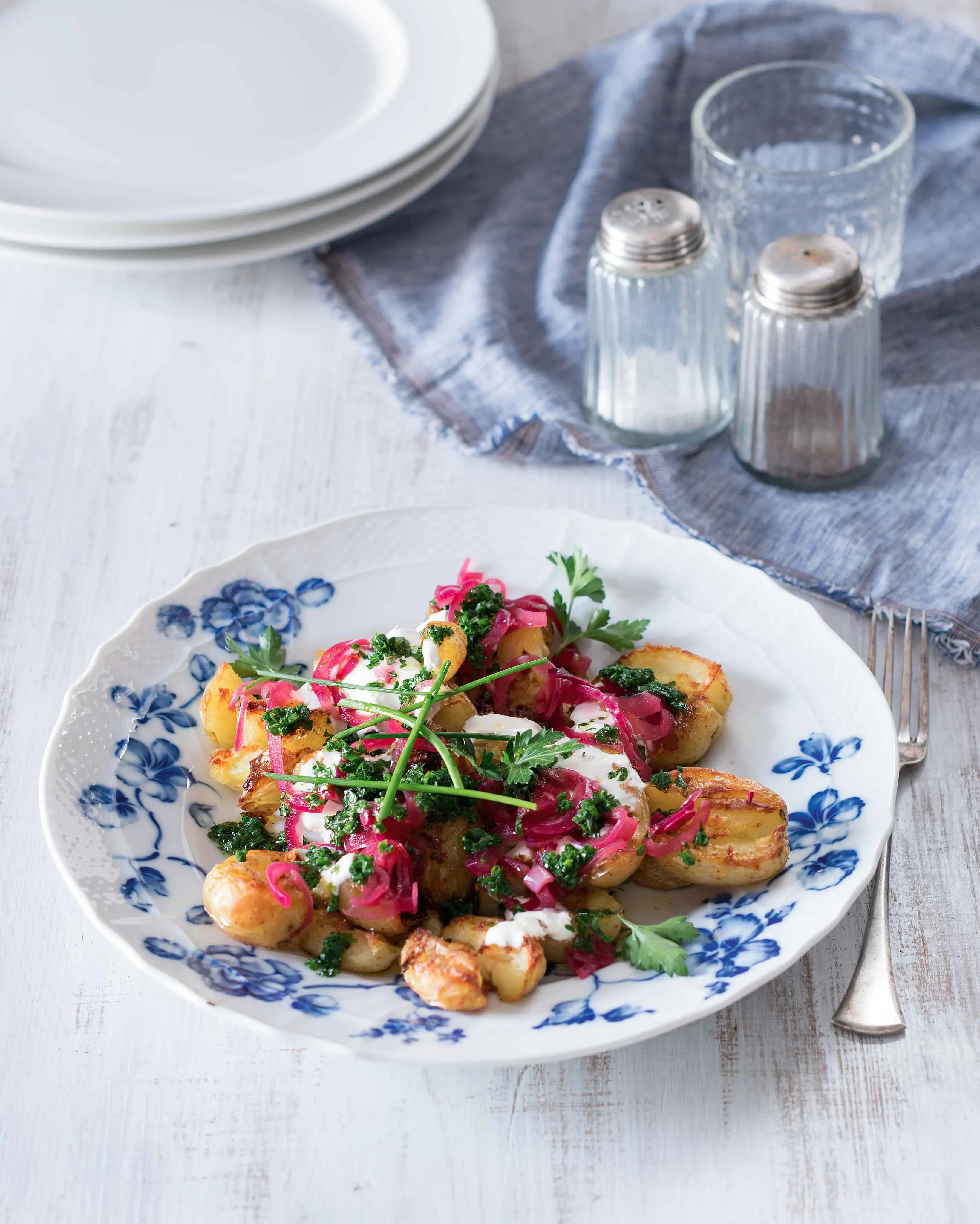 Vylepšená verze brambor na loupačku: brambory jsme upekli, tvaroh vyměnili za zakysanou smetanu, a navíc přidali nakládanou cibulku a petrželkové pesto.