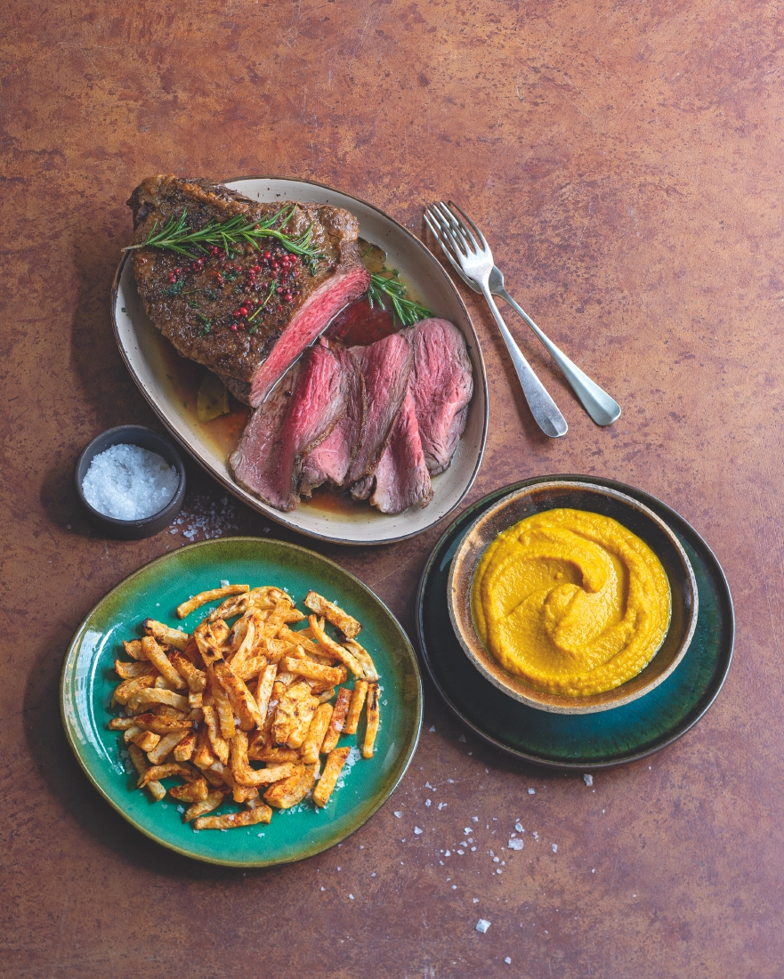 Šťavnatá hovězí pečeně si žádá o neméně skvostnou přílohu. Vsaďte na kořenovou zeleninu! Originální celerové hranolky a mrkvový kečup vás možná překvapí, ale rychle si vás získají svou chutí.