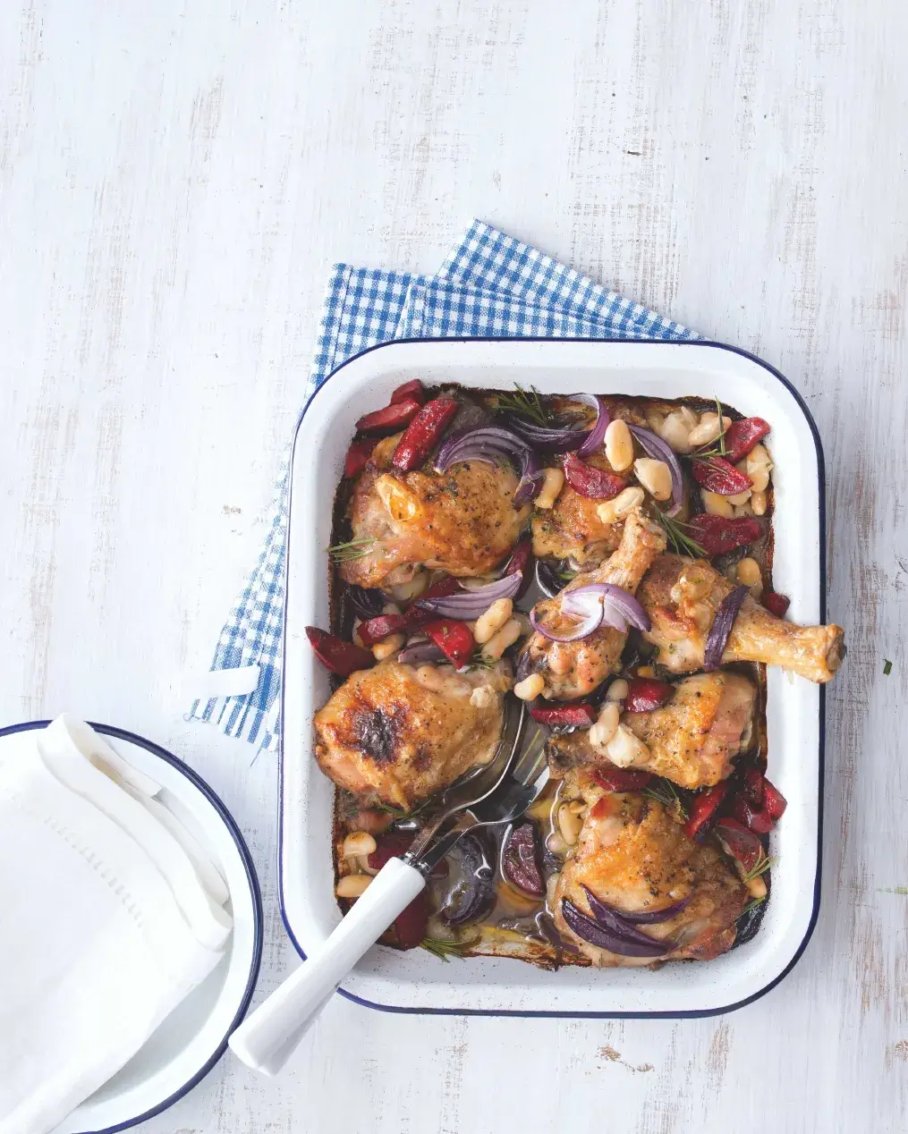 K pečenému kuřátku s fazolemi a chorizem můžete jako přílohu podávat rýži, ale ještě lepší bude čerstvá bílá bagetka, kterou dokonale vytřete onu lahodnou šťávu z talíře (a možná pak i z pekáče).