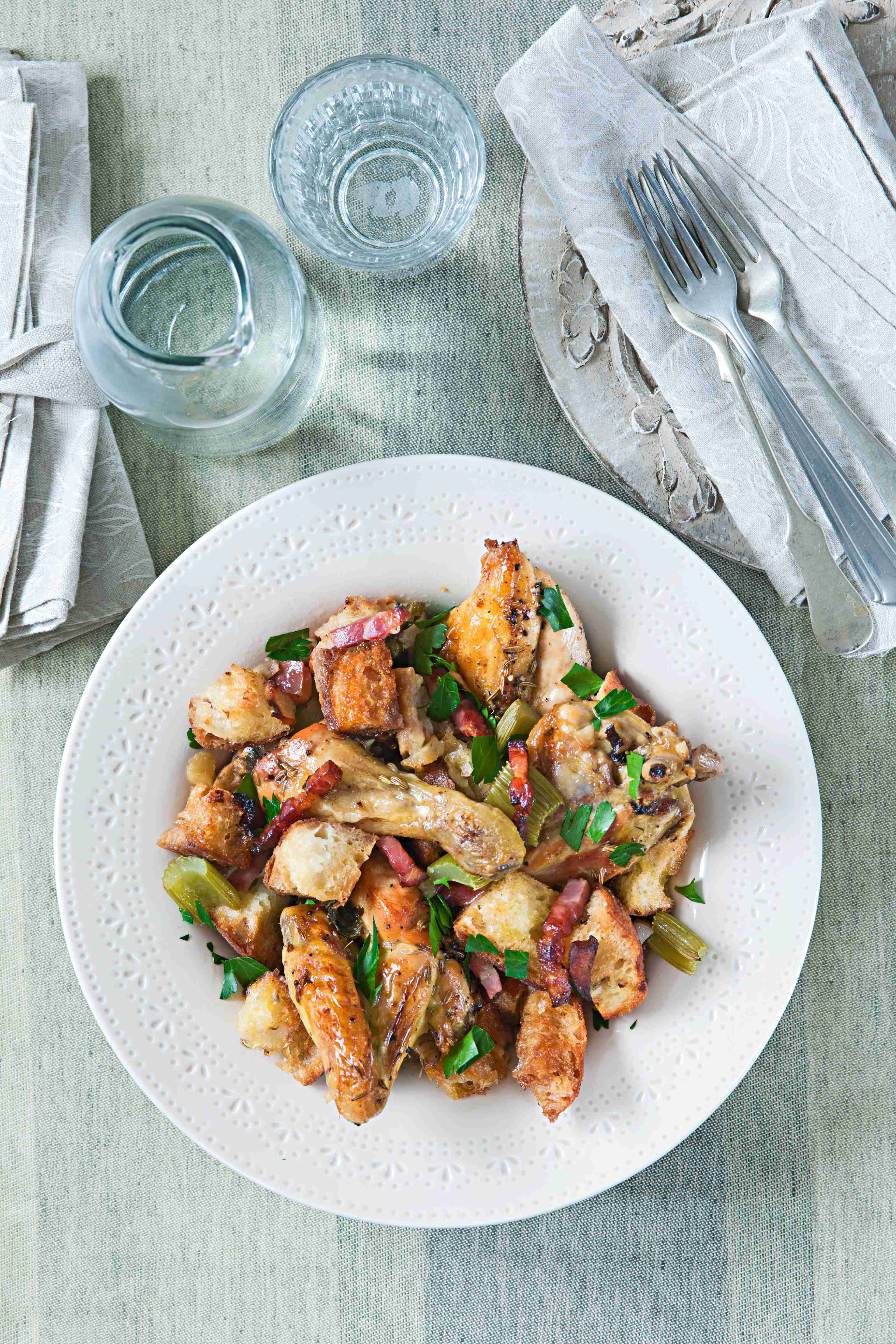 Skvělý nápad na večeři z plechu! Vychutnejte si dozlatova vypečené porce kuřete a křupavý chléb se slaninou. Pečené kuře s nádivkou naruby je překvapivá kombinace tradičních surovin, která rozhodne stojí za pozornost.