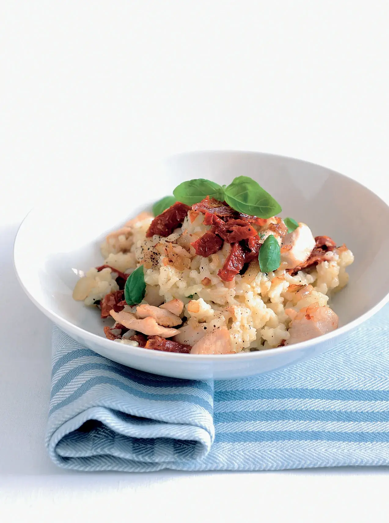Pečené rizoto s kuřecím masem představuje jednu z mnoha variant italské klasiky. Tentokrát se sušenými rajčaty, parmazánem a kuřecími prsy. Skvělá rychlá večeře nebo lehký oběd, po kterém vám nebude těžko. Základem je recept na přípravu rýže na rizoto z trouby.