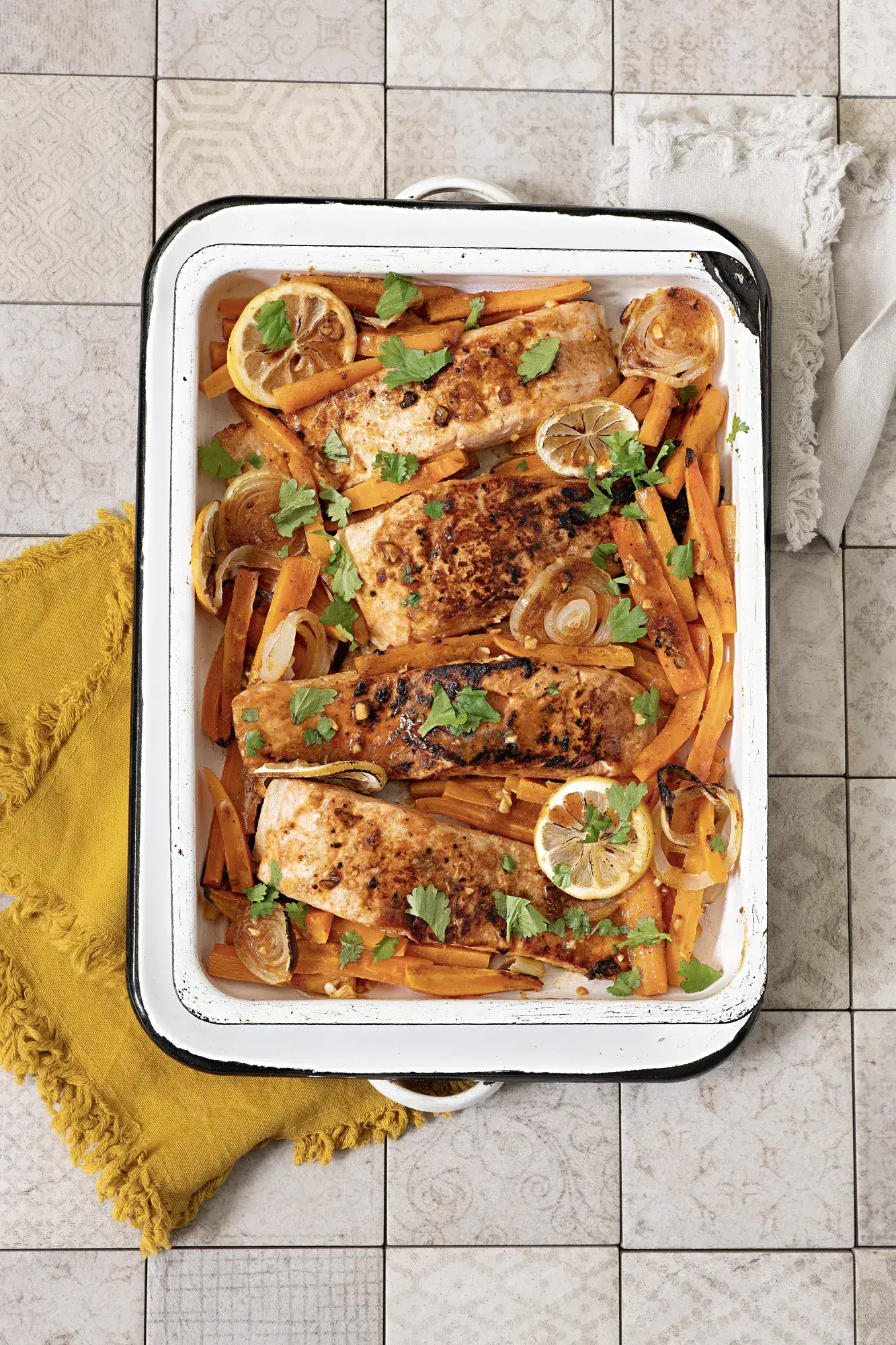 Pokud milujete jídla z jednoho pekáčku, je tohle recept přesně pro vás – snadné, rychlé a variabilní. Pečeného lososa můžete podávat s pečivem, kuskusem či bramborami. Rychlé jídlo, jako stvořené pro teplou rodinnou večeři po náročném dni.
