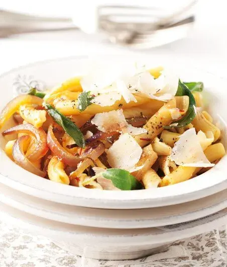 Červená cibule je na rozdíl od žluté sladší a méně štiplavá. Využijte toho při přípravě těstovinové večeře.