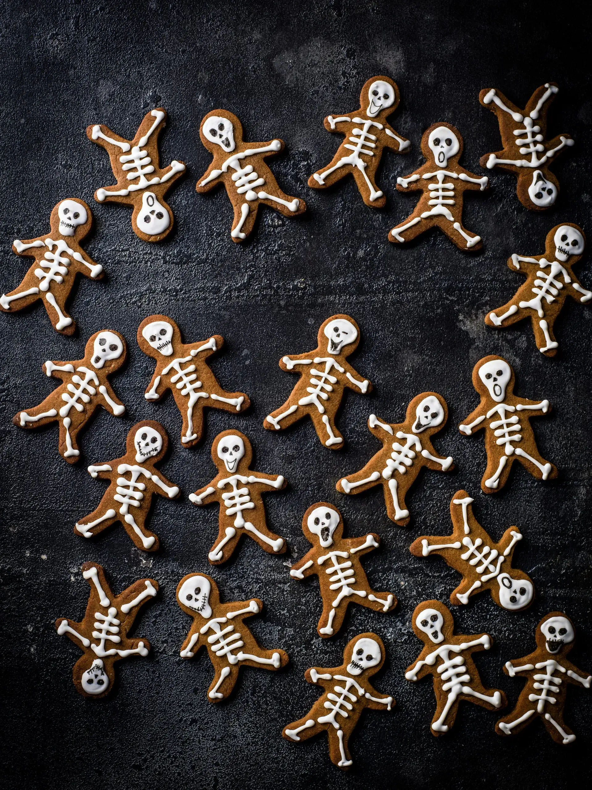 Jak proměnit Pana Perníčka ve strašidelného kostlivce? Jednoduše. Připravte si bílkovou polevu nebo královskou glazuru, sáček s tenkou špičkou a jedlou černou fixu – a můžete se pustit do zdobení. Strašidelní kostlivci jsou skvělou halloweenskou pochoutkou, kterou si děti zamilují.