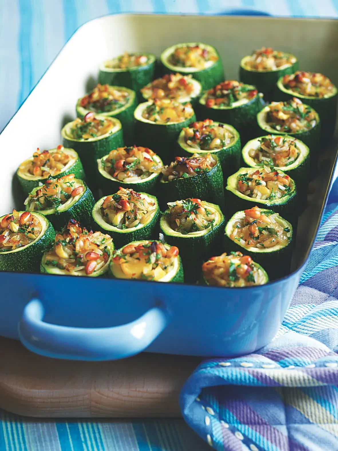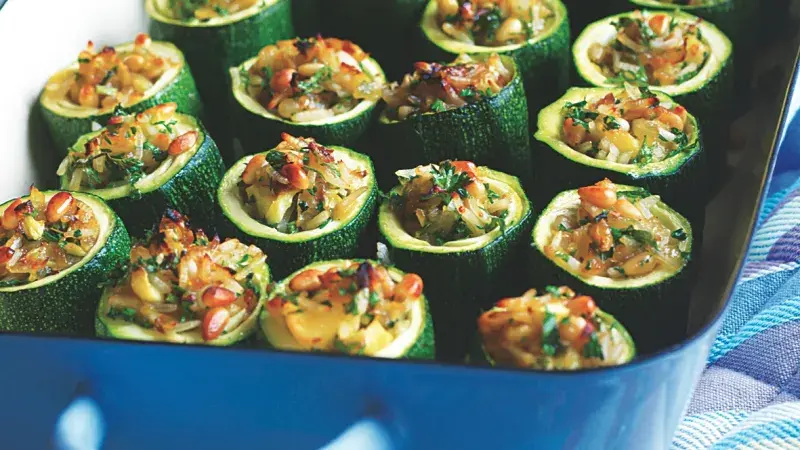 Výrazná rýže, jemně ostrý šmrnc citronů, bylinky a pochopitelně sladké, křupavé pinie dodají cuketám senzační říz!