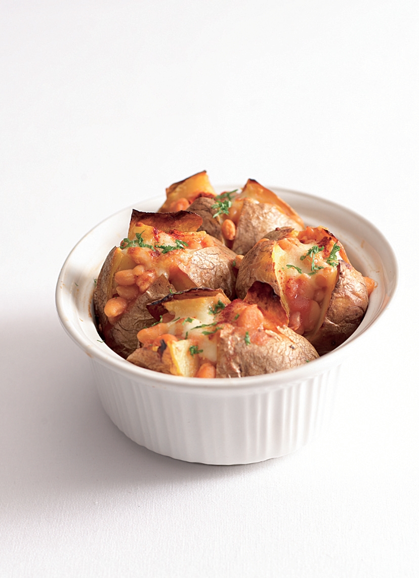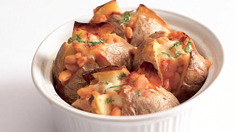 Vegetariánská večeře, která zachutná všem. Brambory s fazolemi v rajčatové omáčce, posypané mozzarellou, ochucené uzenou paprikou.