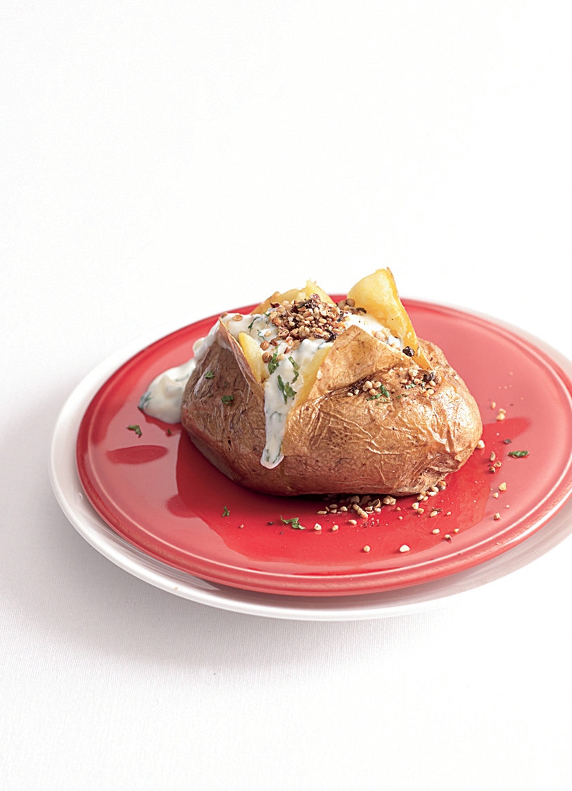 Tentokrát si pečenou bramboru dochuťte po řeckém způsobu. Stačí hustý lahodný jogurt, mátové lístky a koření.