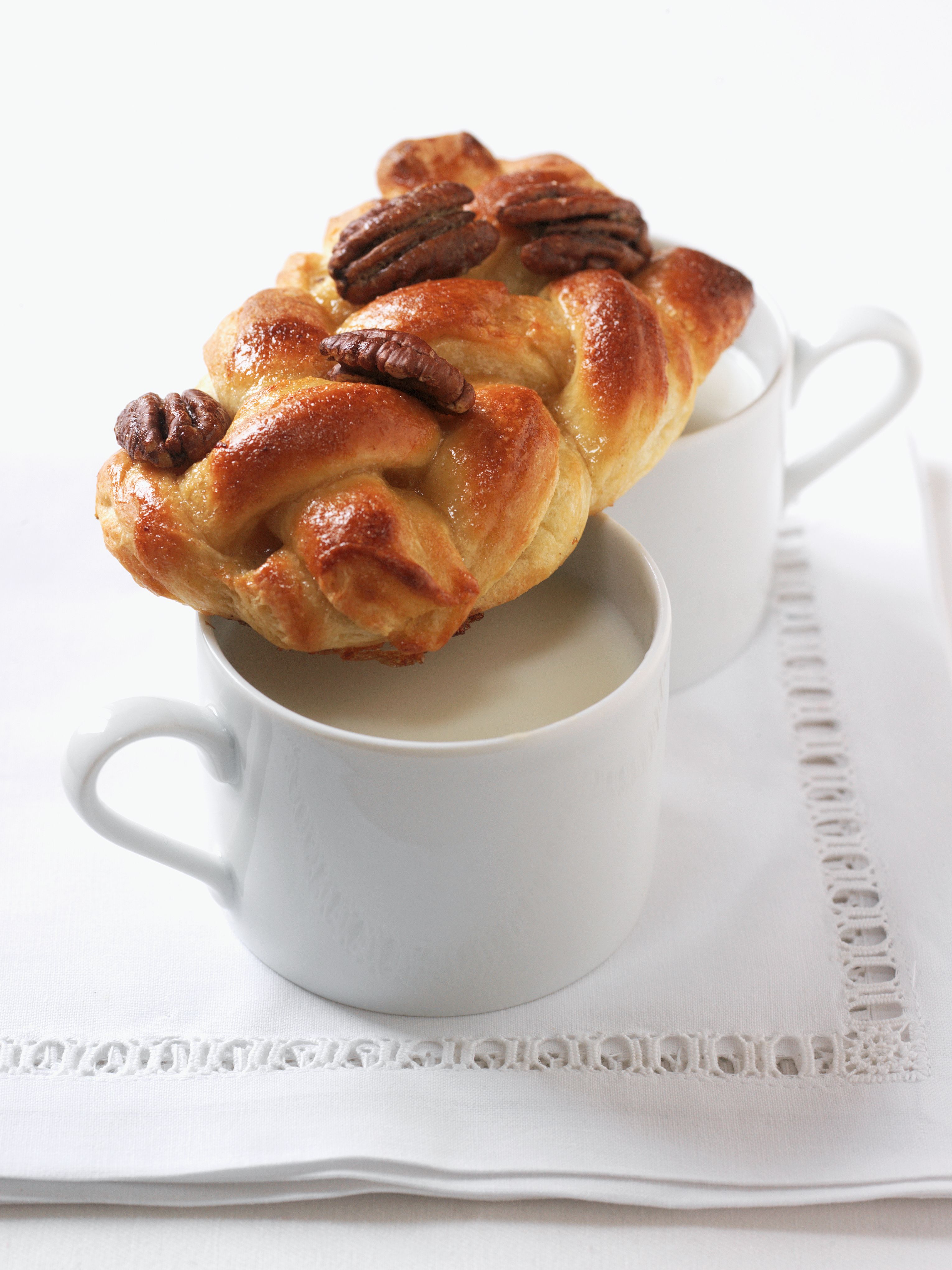 Těsto nakrájejte na centimetr silné ,provázky‘ a vždy po čtyřech je splétejte do pletence (stejně jako vánočku). Ze vzniklých copů nakrájejte 12 centimetrů dlouhé zákusky. Potřete vajíčkem a nazdobte pekany. V půlce pečení přelijte medovo-vaječnou polevou.