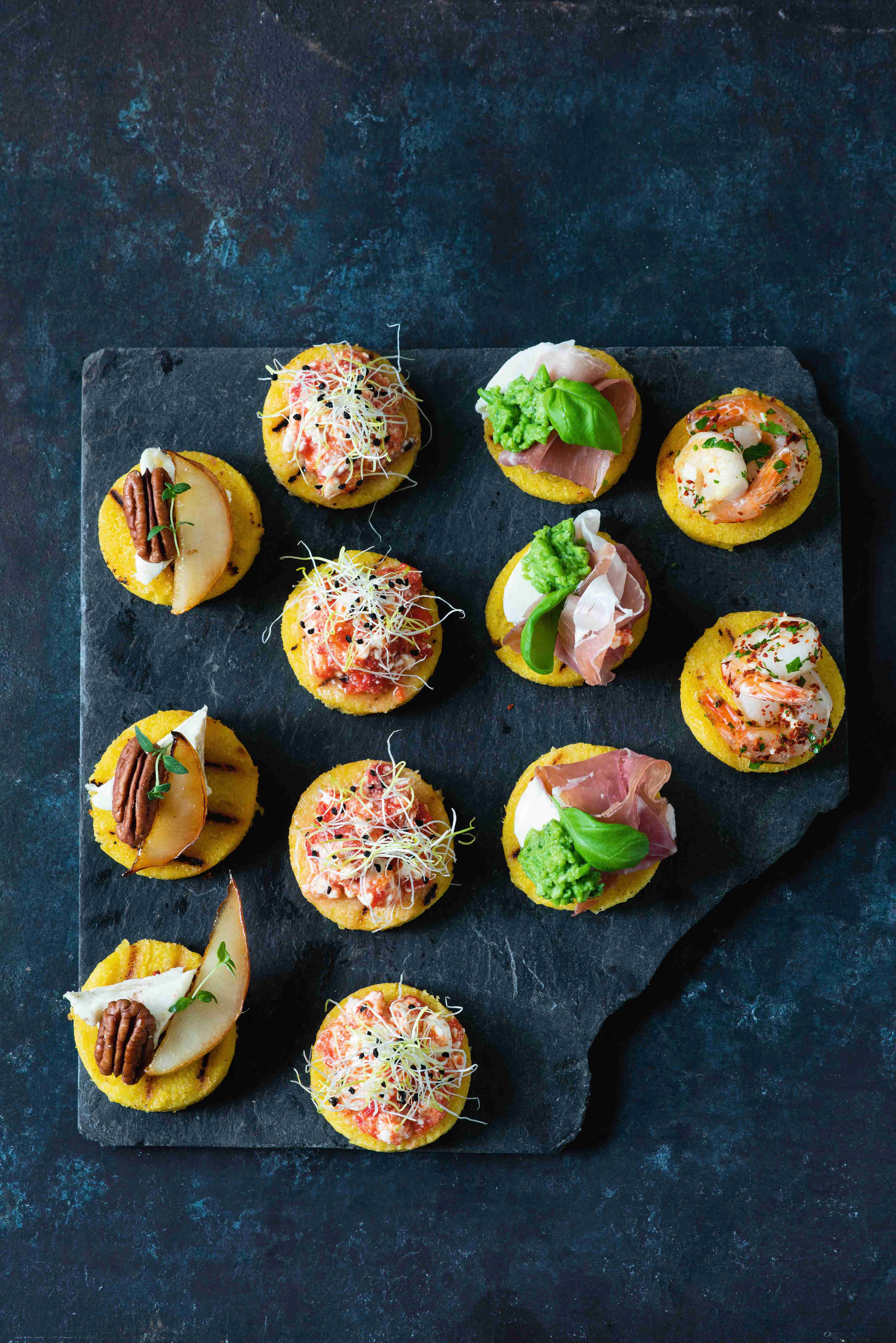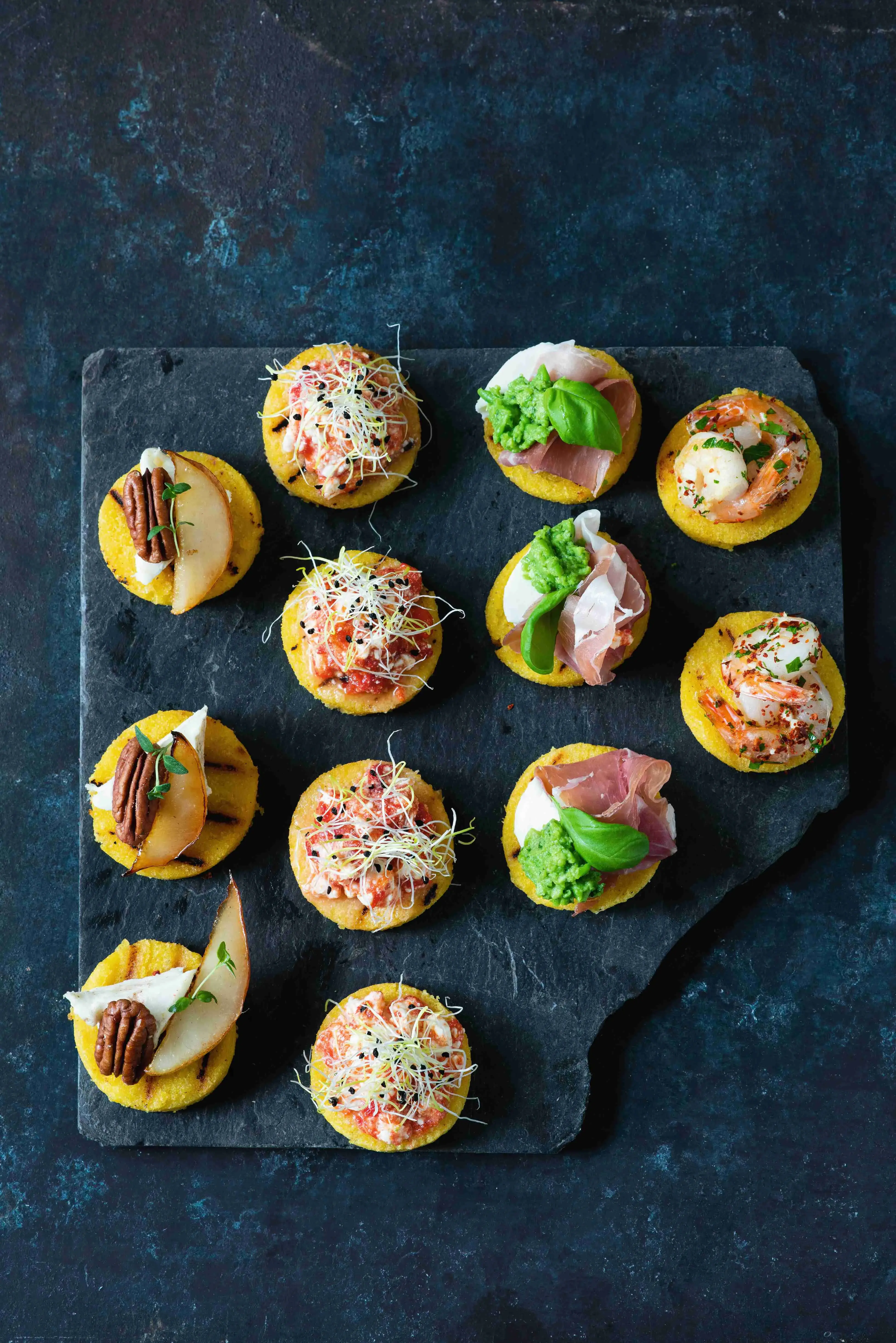 Jednohubky z polenty jsou netradiční, přirozeně bezlepkové a chutné. Mohou mít tisíc a jednu podobu. Stačí si vyhrát nejen s tím, co na ně dáte, ale také se samotnou polentou. Pro inspiraci jsme si pro vás připravili hned 4 různé nápady – jednohubky se sýrem, s pečenými paprikami, s mozzarellou a s krevetami.