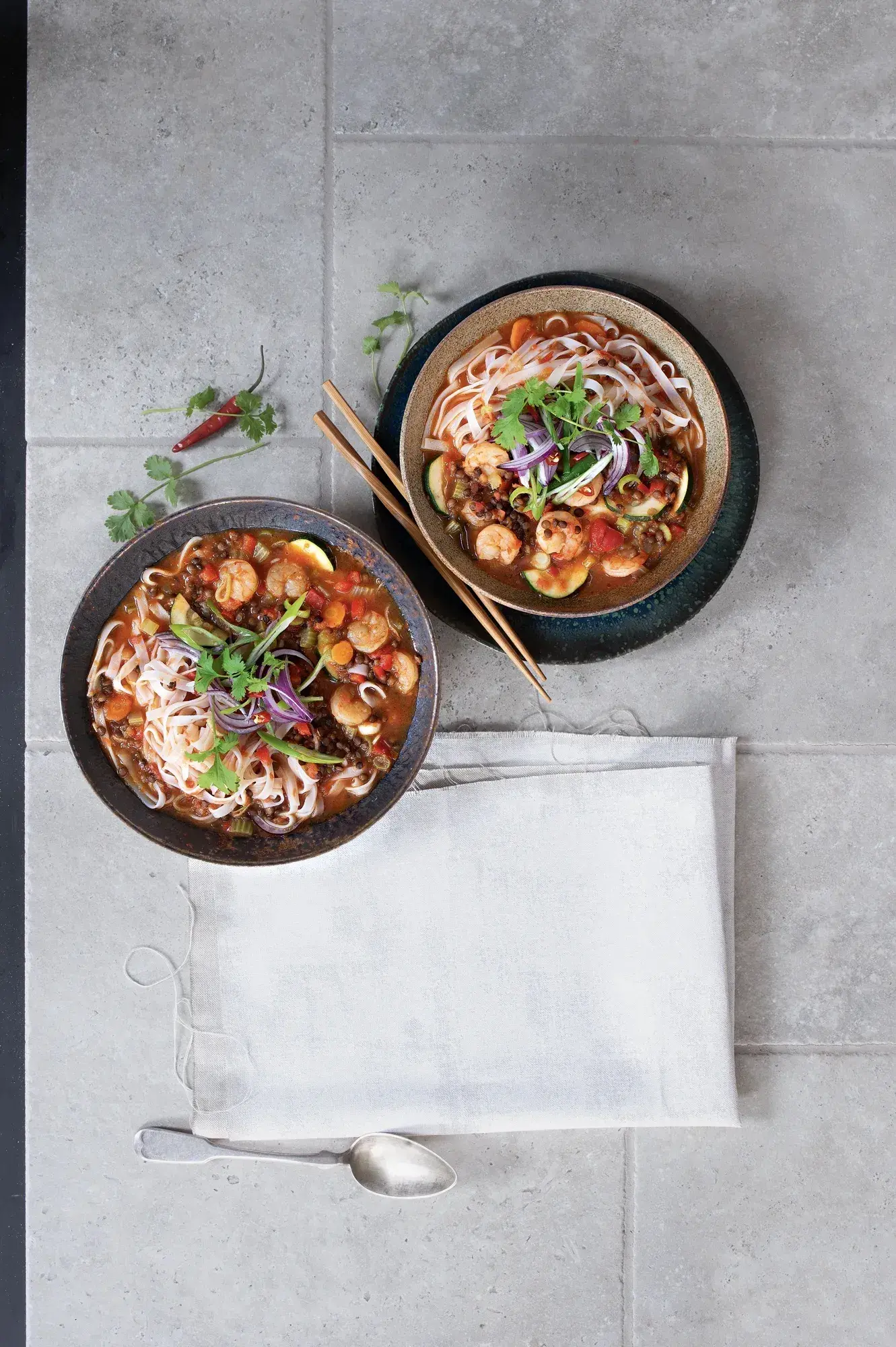 Vydatná polévka plná zeleniny i chutí. Marek Kučera, náš dvorní fotograf, ji rád obměňuje – krevety třeba vymění za kuře, někdy dá víc toho a jindy zase onoho. „Tahle polévka vznikala postupně a vlastně jde o mix – z každého focení, kde mi něco chutnalo, jsem si do ní něco vzal a přidal,“ směje se Marek.