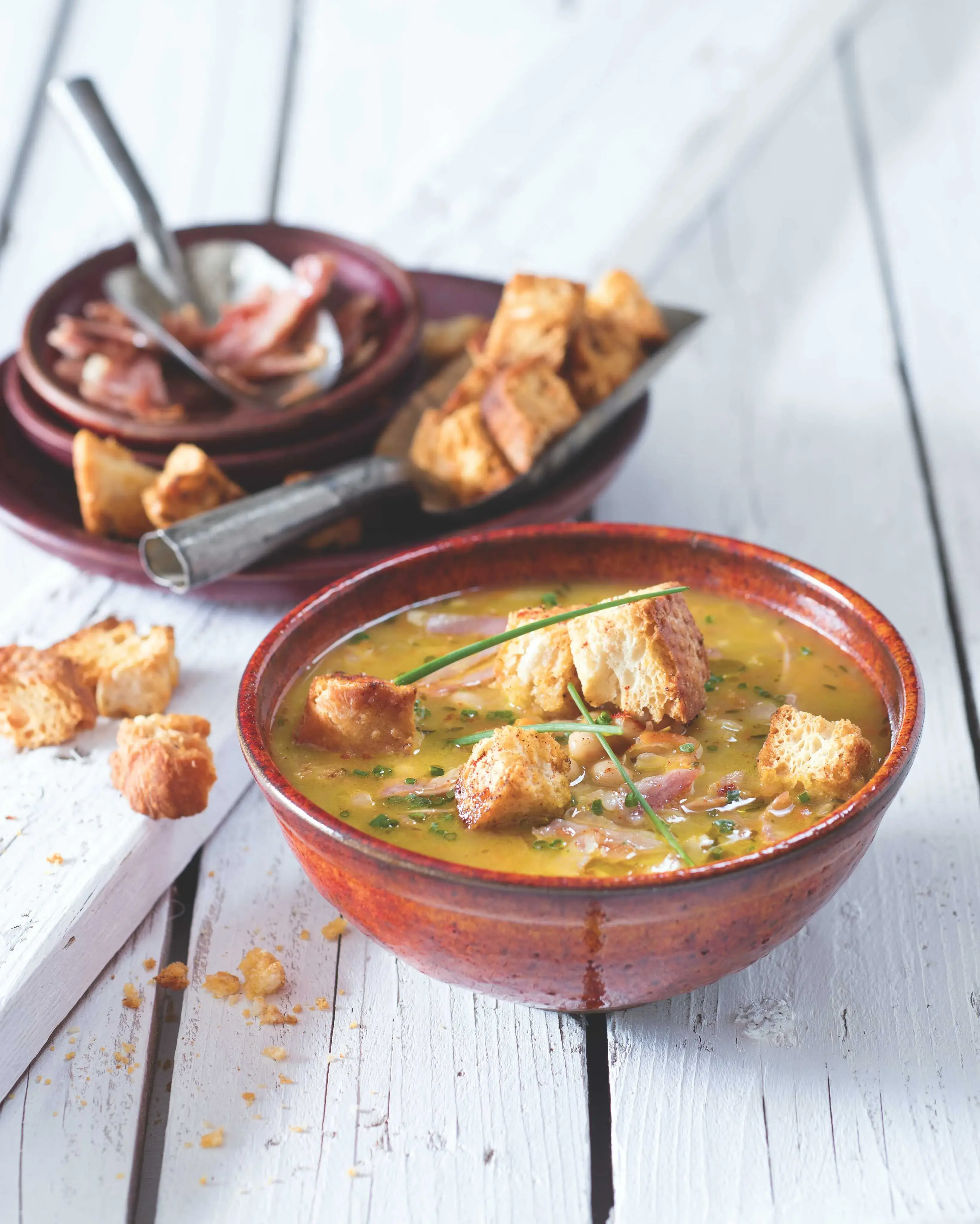 Fazolovou polévku jsme původně chtěli rozmixovat, ale nakonec jsme se rozhodli zachovat její příjemnou strukturu. Máte-li raději krémové polévky, rozmixujte ji a šunku vmíchejte až potom. Polévka z bílých fazolí uchvátí už jen tím, jak vypadá, natož co teprve až ji ochutnáte. Do receptu jsme použili bílé fazole v konzervě, ale pochopitelně je můžete den předem namočit a uvařit do měkka, výsledek bude stejně delikátní.