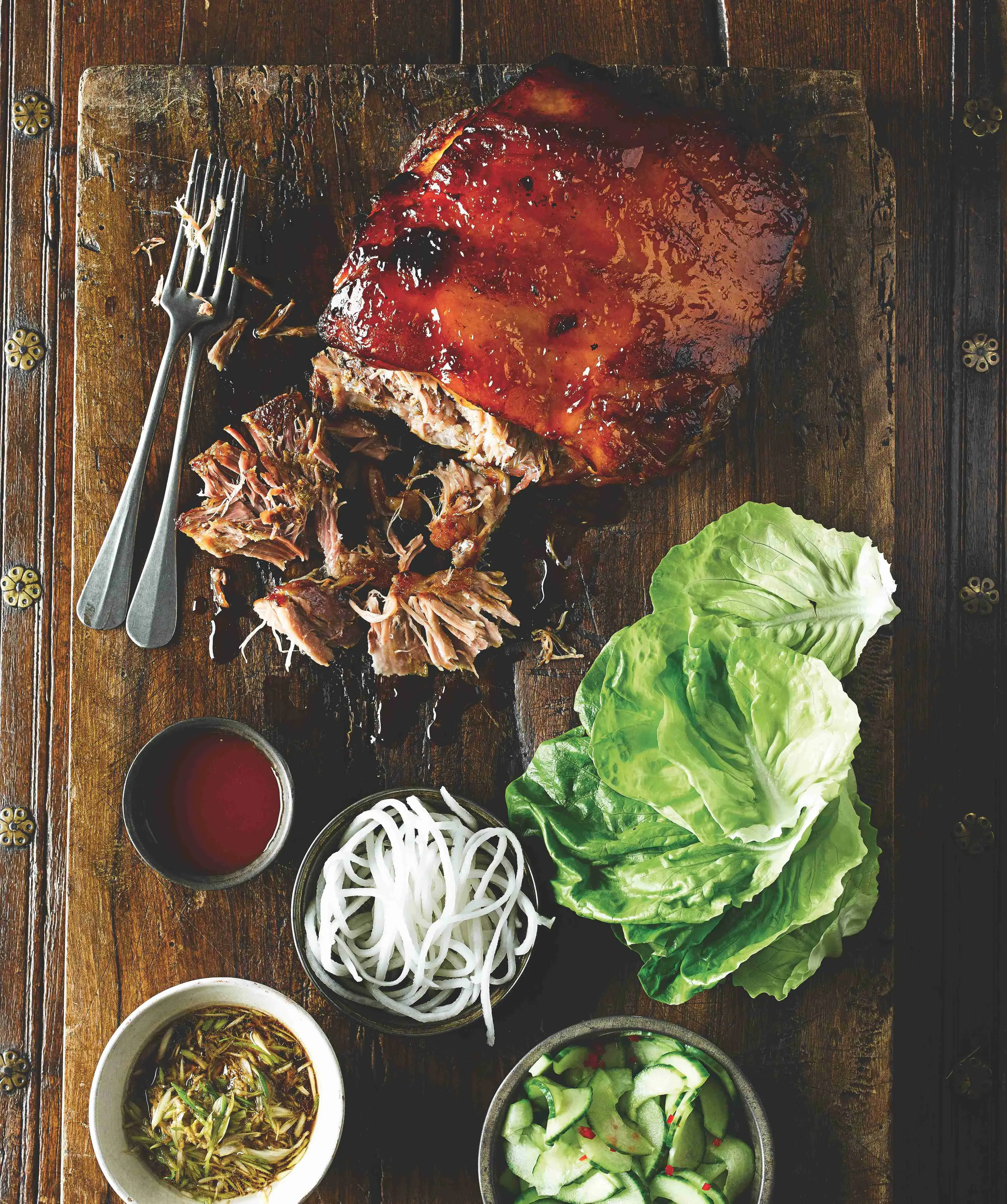 Pomalu pečené vepřové ramínko po korejsku je skvělý způsob, jak pohostit spoustu lidí naráz – nachystejte všechny doplňky a nechte každého, ať si udělá vlastní salátové balíčky. Maso můžete upéct den dopředu a pak ho před podáváním potřít glazurou a prohřát pěkně dožhava.
