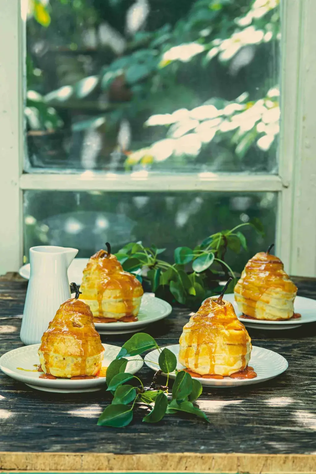 Působivé na pohled a chuťově dokonalé, takové jsou tyhle hrušky, povařené v medovém sirupu s kořením a pak zapečené v máslovém listovém těstě.