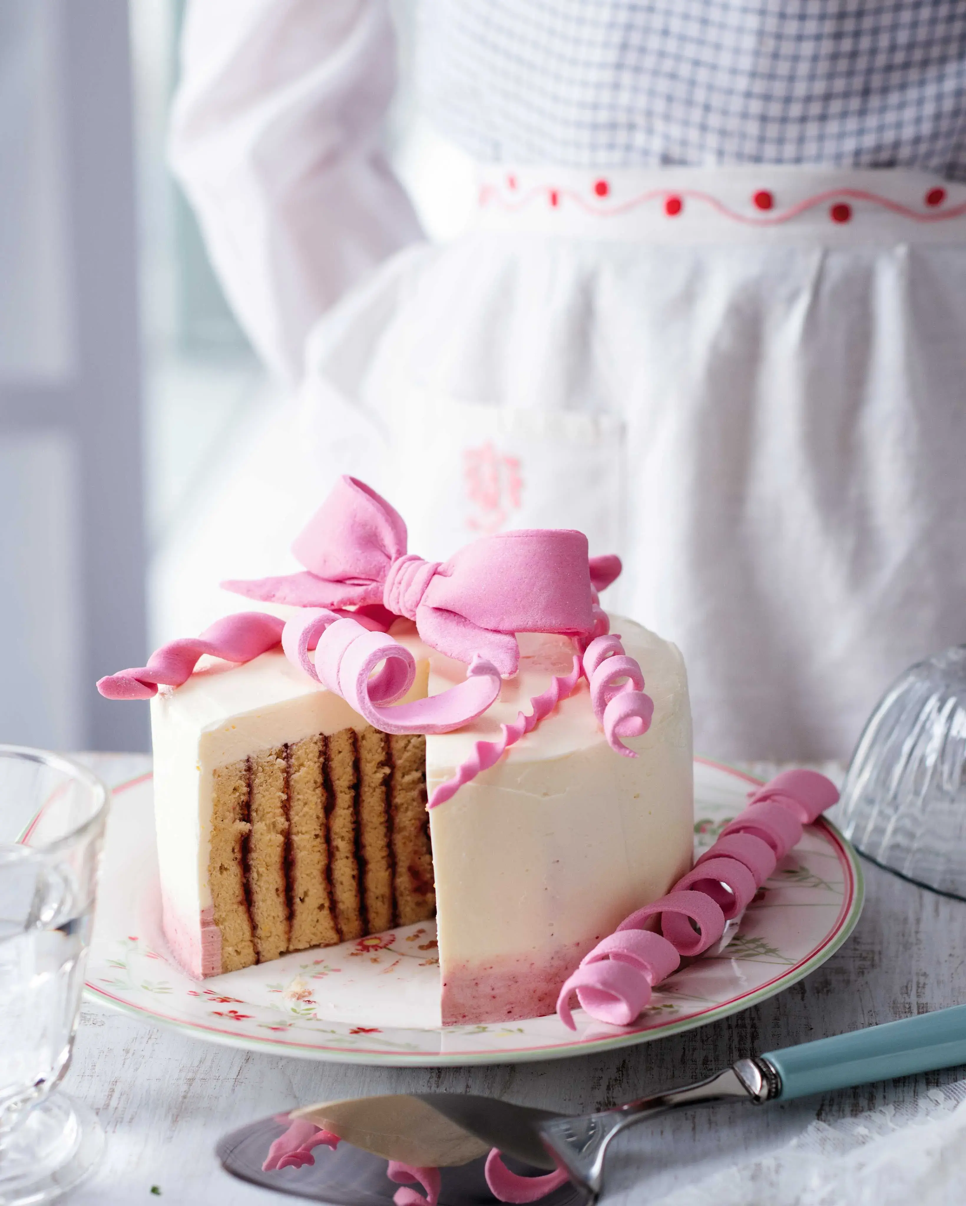 Vypadá opravdu efektně a přitom je to vlastně ‚jen‘ velká roláda. Parádní kabátek zajistí dvojbarevný krém a o pomyslnou korunu se postará sladká mašle z domácího fondánu.