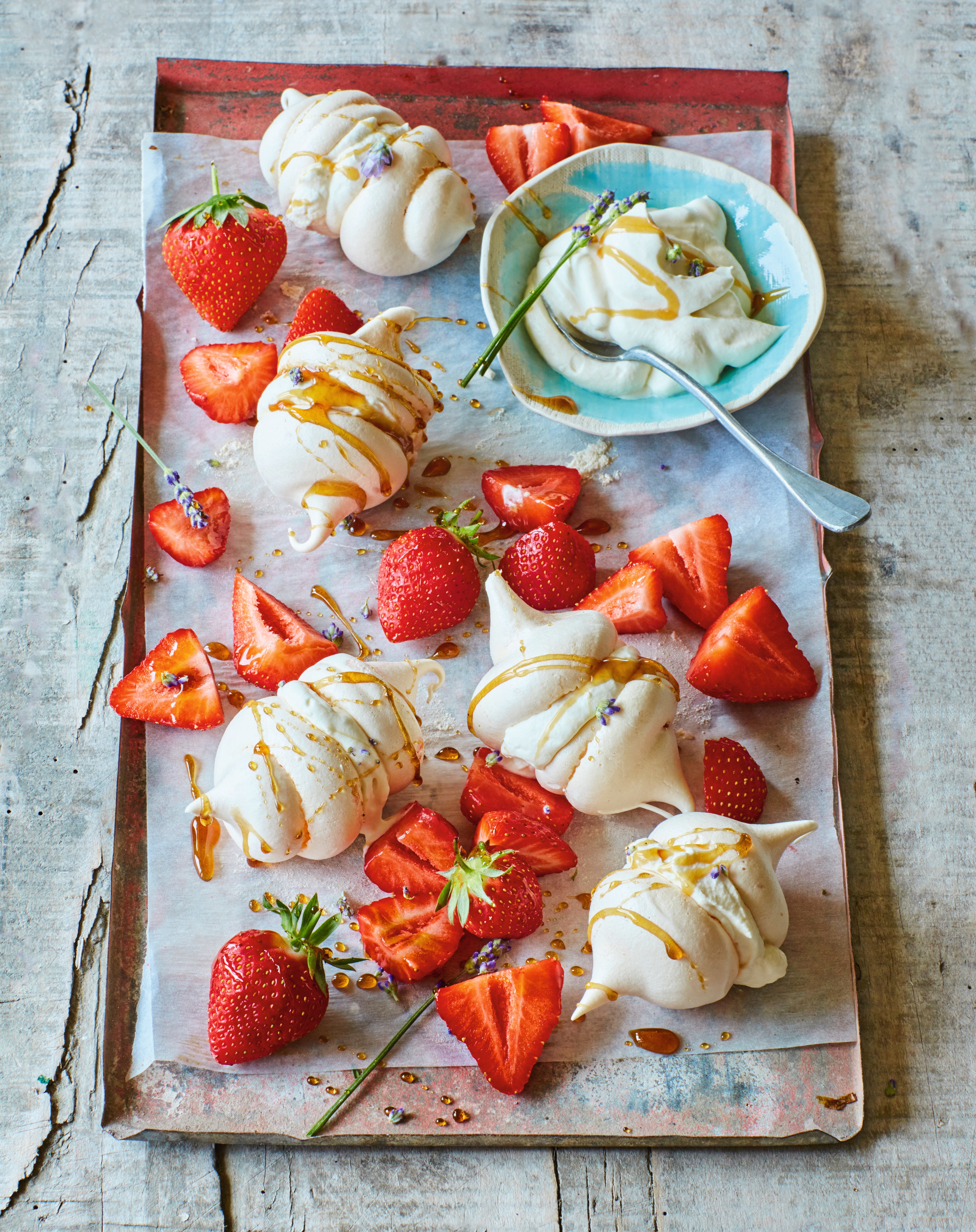 Sněhové pusinky spojené levandulovým krémem a doplněné o kousky jahod – dokonalá symfonie chutí. Letní bezlepkový dezert, který zažene chuť na sladké, osvěží a přitom příliš nezatíží. Recept je velmi jednoduchý a pusinky si klidně napečte dopředu, v uzavřené nádobě vydrží až týden.
