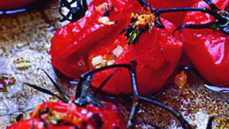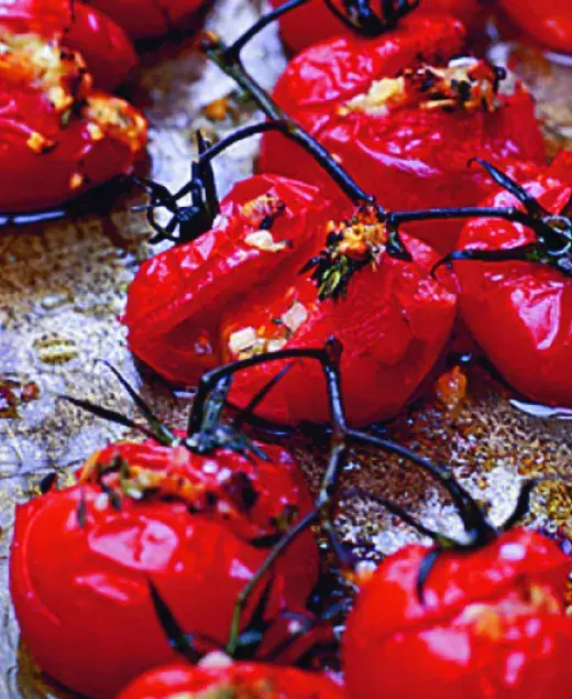Přirozeně sladká chuť rajčat pečením ještě zesílí. Skvěle doplní třeba mořskou rybu pečenou v solné krustě.