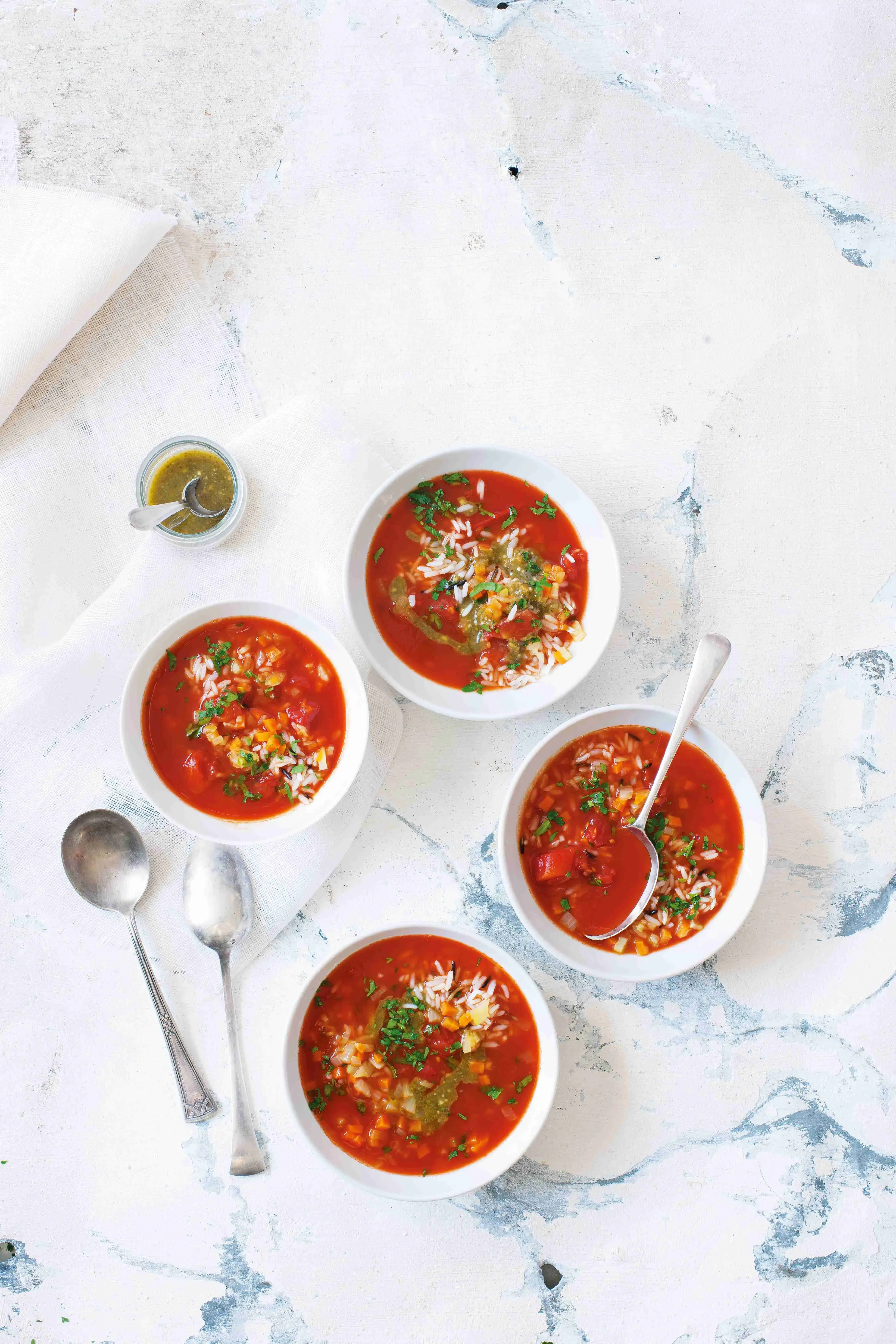 Tahle rajčatová polévka je opravdu lepší z krájených rajčat v konzervě než z čerstvých plodů, a tak ji můžete vařit celý rok bez ohledu na úrodu. Rajčatová polévka s rýží vám možná připomene školní jídelnu, ale věřte, že spíš pouze názvem než jsou svou fantastickou chutí.