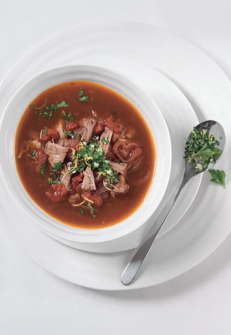 Masový vývar, ossobuco společně vytvoří báječnou chuť polévky. Posypejte voňavou směsí z petrželky, citronové kůry a česneku. Polévku můžete přiostřit trochou chilli.