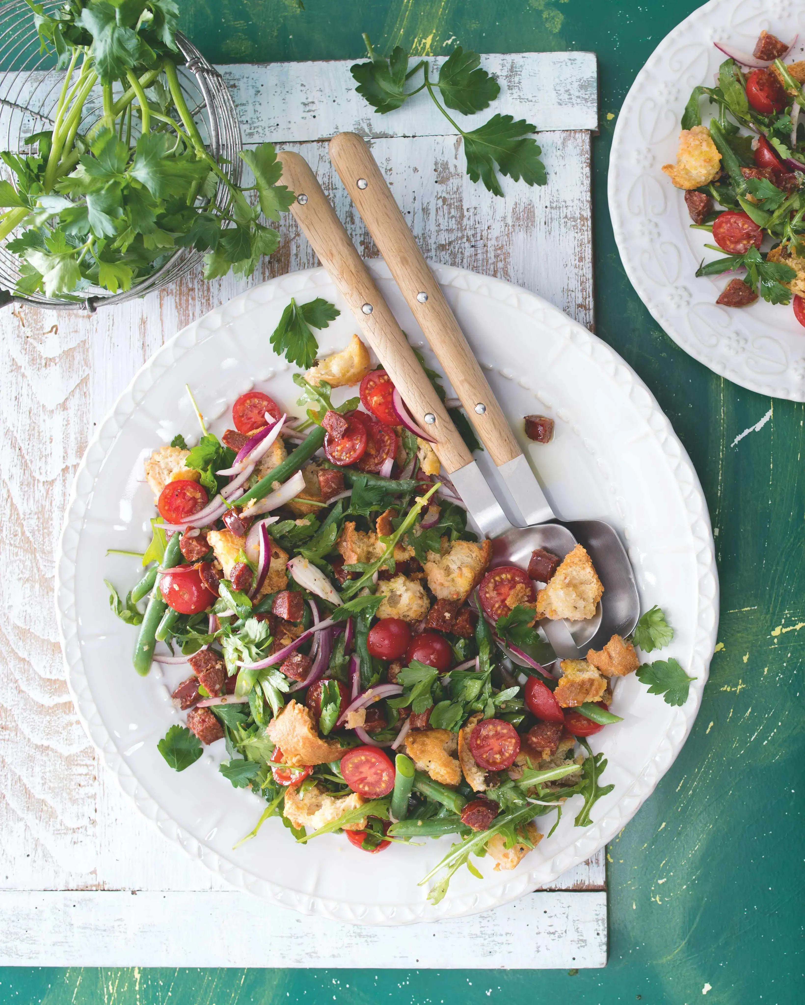 Svěží rajčatový salát skvěle doplní pikantní chorizo a křupavé opečené krutony.