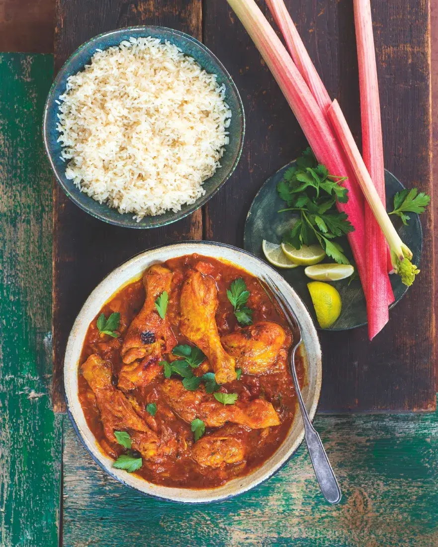 Řapíky rebarbory, oblíbené jarní zeleniny, zužitkujete nejčasteji do dezertů a kompotů. Díky své nakyslé chuti však ladí i k masu a sýrům. Rebarborové kuře s rýží je toho tím nejlahodnějším důkazem. Svěží jarní recept určitě oceníte coby víkendový oběd.