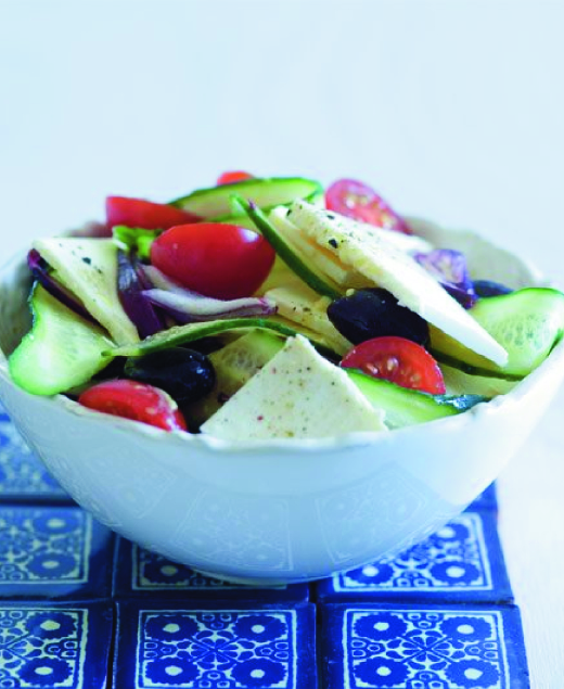 Osvědčený salát s olivami, sýrem feta a rajčátky pro slunečné dny.