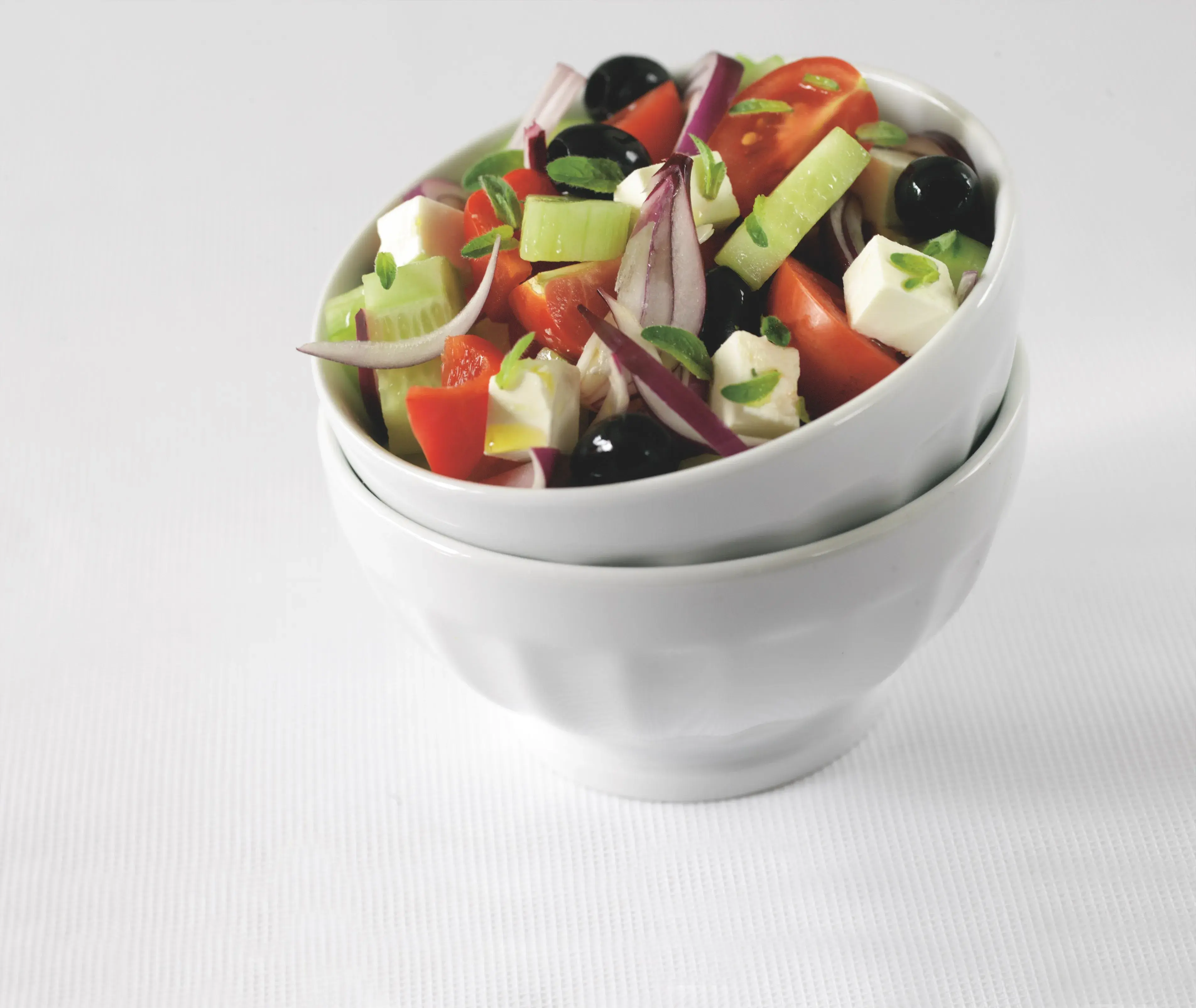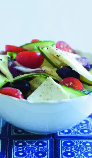 Řecký salát s octem bezkonkurenčně skvělý – jen musíte použít prvotřídní šťavnatou zeleninu, která má intenzivní chuť. Salát není třeba solit, feta bývá dost slaná sama o sobě, ale i tak doporučujeme postavit slánku společně s vinným octem na stůl.