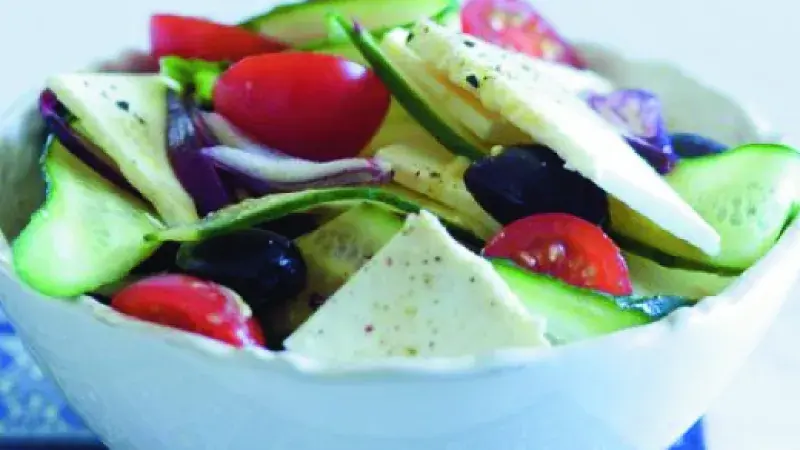 Osvědčený salát s olivami, sýrem feta a rajčátky pro slunečné dny.