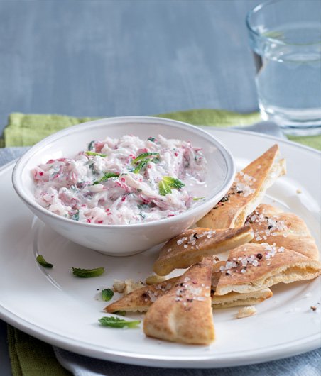 Když do dipu zapojíte jogurt a křupavou čerstvou zeleninu (můžete ji obměňovat podle sezony) a smažené lupínky vyměníte za opečené chlebové placky, mlsání se rázem změní ve zdravou svačinku nebo lehkou večeři.