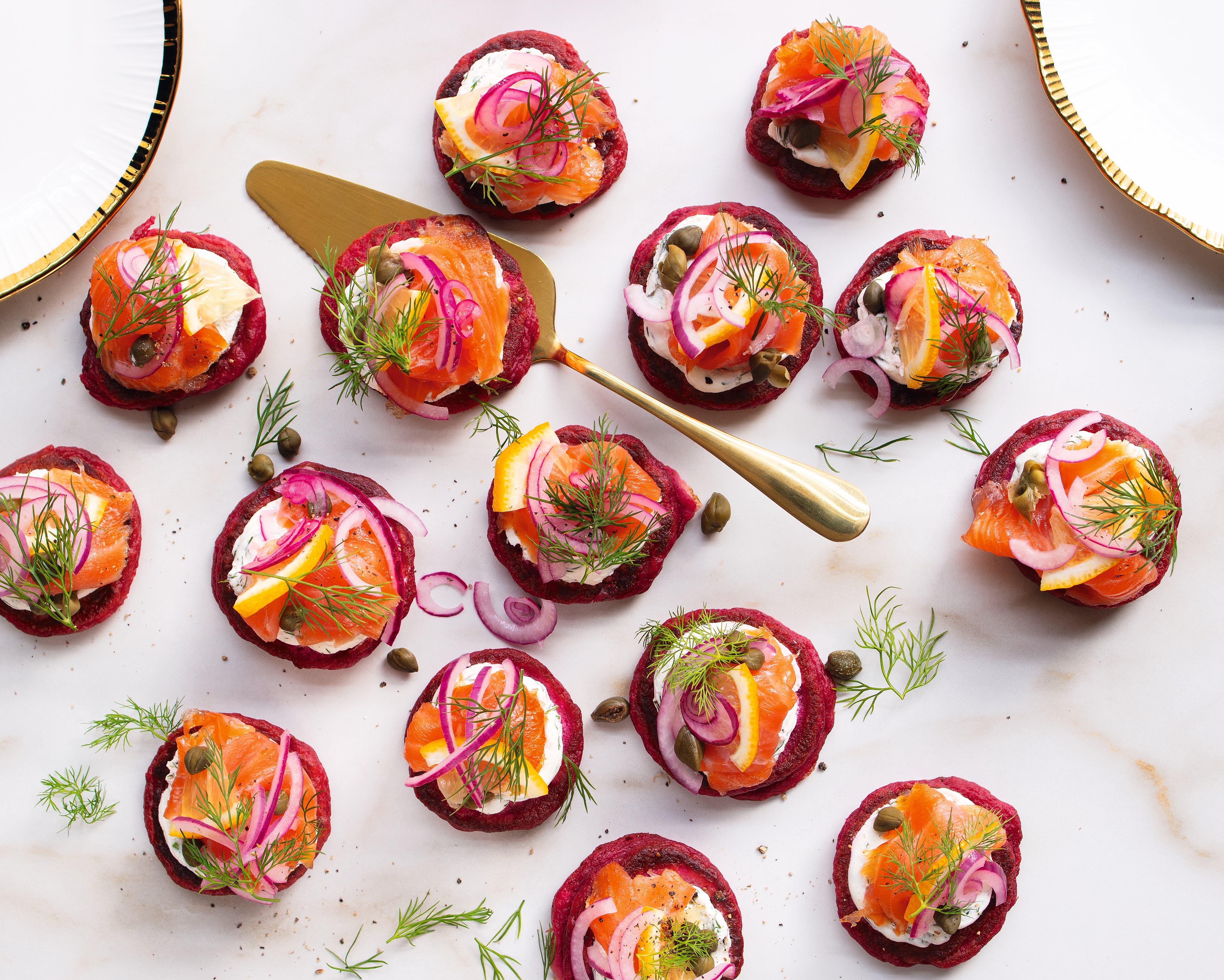 Řepné bliny s uzeným lososem a koprem svým barevným provedením rozzáří silvestrovskou tabuli. Navíc jsou až neodolatelně chutné. Perfektní recept pro chvíle, kdy chcete svým přátelům nabídnout něco víc než jen obyčejné chuťovky.