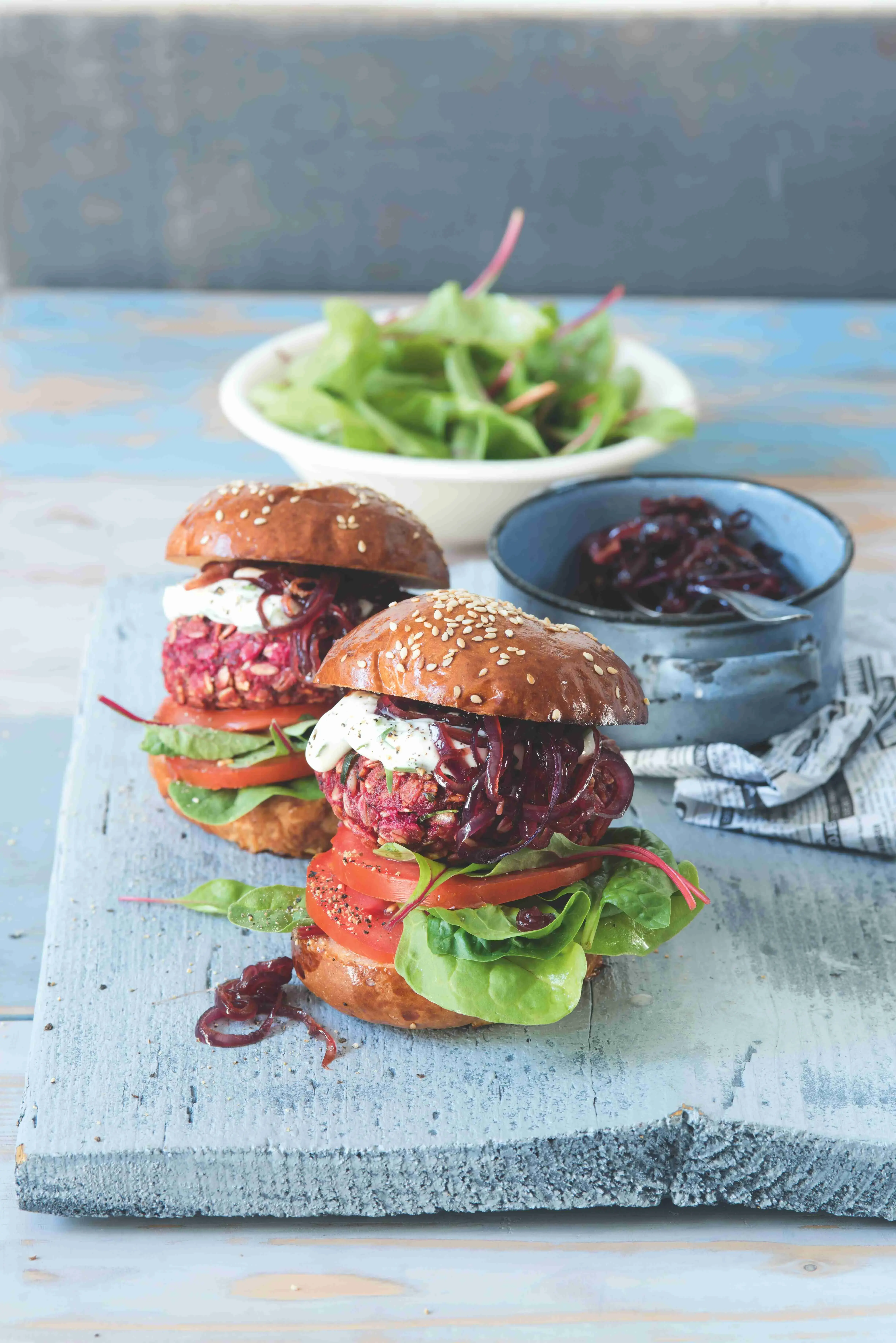 Naše burgery z červené řepy jsou vegetariánské a tak akorát pro dvě osoby. Práci si můžete usnadnit tím, že si koupíte už vařenou vakuovanou červenou řepu. Případně si ji uvařte den předem.