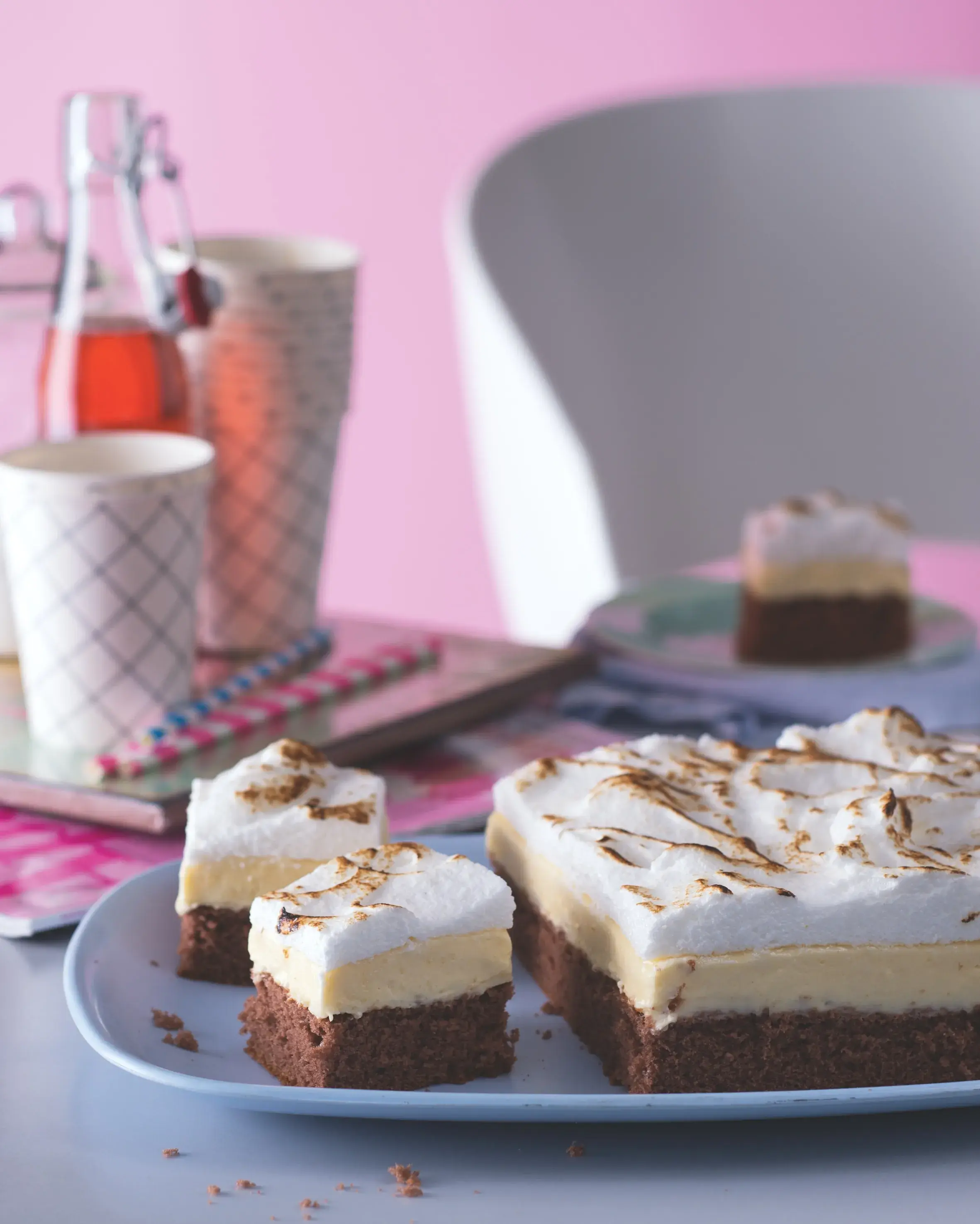 Přestože obvykle doporučujeme v případě hodně sladkých receptů, že cukr je možné snížit podle chuti, u těchto řezů bych byla s radikální změnou poměrů surovin opatrná. Vzhledem k tomu, že jde o tři komponenty klasické cukrařiny: piškotové těsto, žloutkový krém a sníh, kteréžto všechny tři cukr potřebují jako prvek, který je pomáhá držet pohromadě: cukr reakcí s vaječnými proteiny stabilizuje při šlehání vejce, a tím zajišťuje, že ani těsto, ani sníh nespadne, a zároveň při pečení pomáhá těstu růst – činí těsto pružnějším, takže v něm zůstávají vzduchové bublinky, které zajišťují upečenému korpusu nadýchanost. Takže v případě těsta bych osobně ubrala maximálně 30 g cukru (na 5 vajec bych dala 150 g, tj. 30 g cukru na 1 vejce) – jinak se obávám, že nelze zaručit, že těsto bez kypřicího prášku při pečení nespadne. U žloutkového krému cukr zpomaluje srážení vajec, tedy zajistí vám, že po tepelné úpravě, která je nutná kvůli pasterizaci, nebudete mít místo hladkého krému míchaná vajíčka. Porovnala jsem různé recepty na žloutkový krém a poměr cukru k žloutkům vychází mezi 20–30 g cukru na 1 žloutek, tedy v případě krému z našeho receptu by šlo množství cukru snížit o 50–100 g, dál bych se z výše zmíněných technologických důvodů snižovat nepokoušela. V případě sněhu cukr opět zajišťuje jeho stabilitu, vzhledem k tomu, že jde o typ sněhu vyšlehaný s horkým cukrovým sirupem, který se používá na dekoraci dortů právě proto, že díky zahřívání a vysokému množství cukru z něj nevyprchá vzduch, a tudíž nespadne, do poměru surovin bych v tomto případě nezasahovala vůbec.