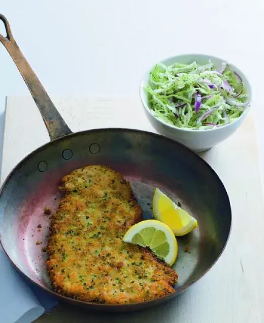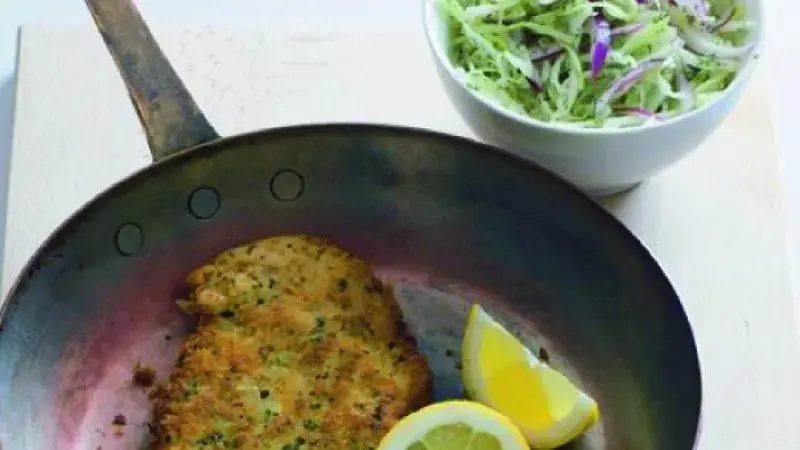 Skvostný řízek, nestárnoucí klasika, doplňte nadrobno nakrájeným zelím a čerstvým koprem.