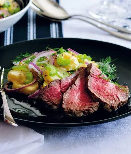 Rostbífu to nejvíce sluší s bramborami ve všech podobách. My vám k němu servírujeme bramborový salát s celerem a hořčičnou zálivkou.