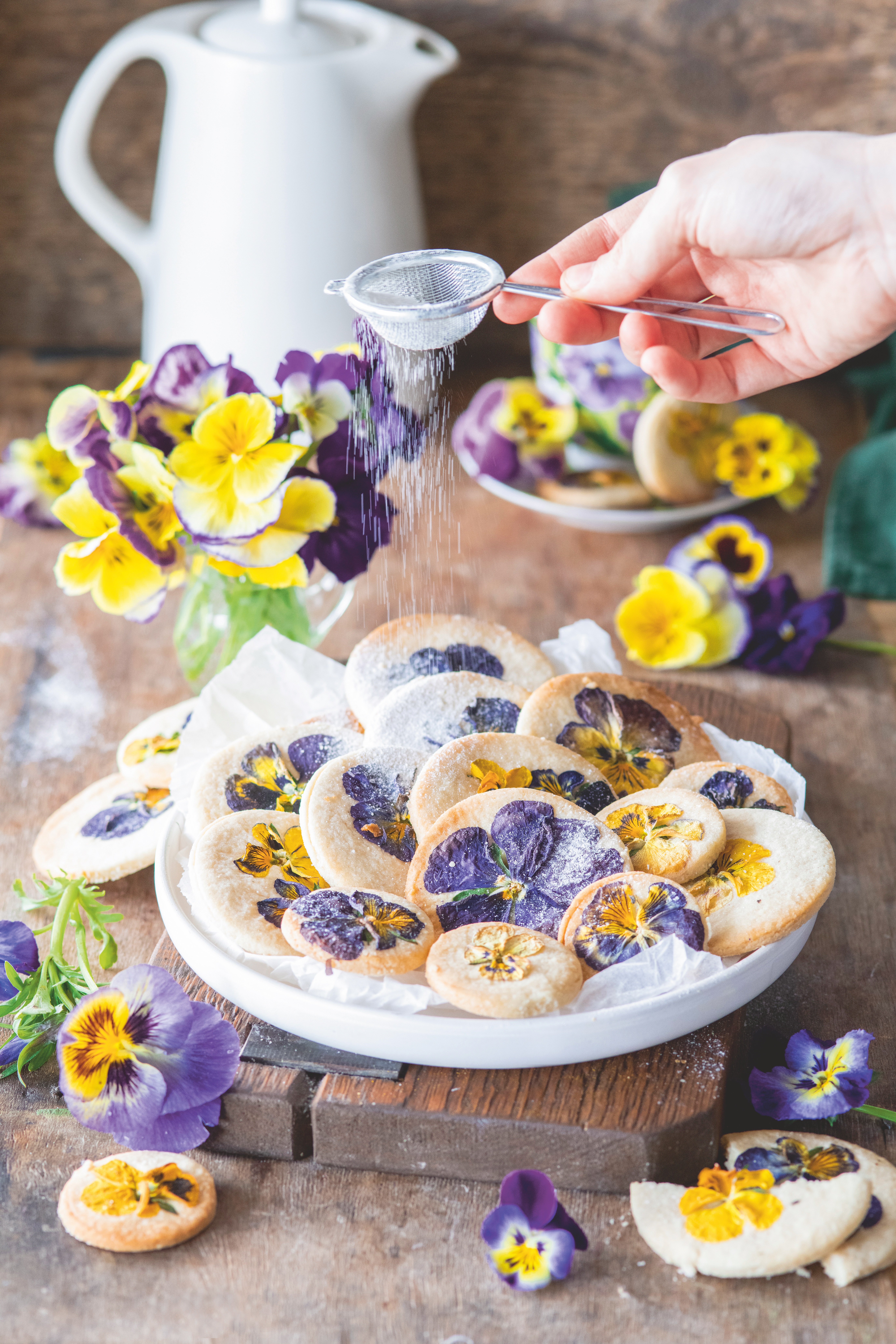 Rozkvetlé sušenky vyrazí vašim hostům dech. Nejjednodušší způsob, jak zapracovat květiny do sušenkového těsta, je lehce je zatlačit pomocí válečku. Pečicí papír je ochrání před poškozením a potrháním.