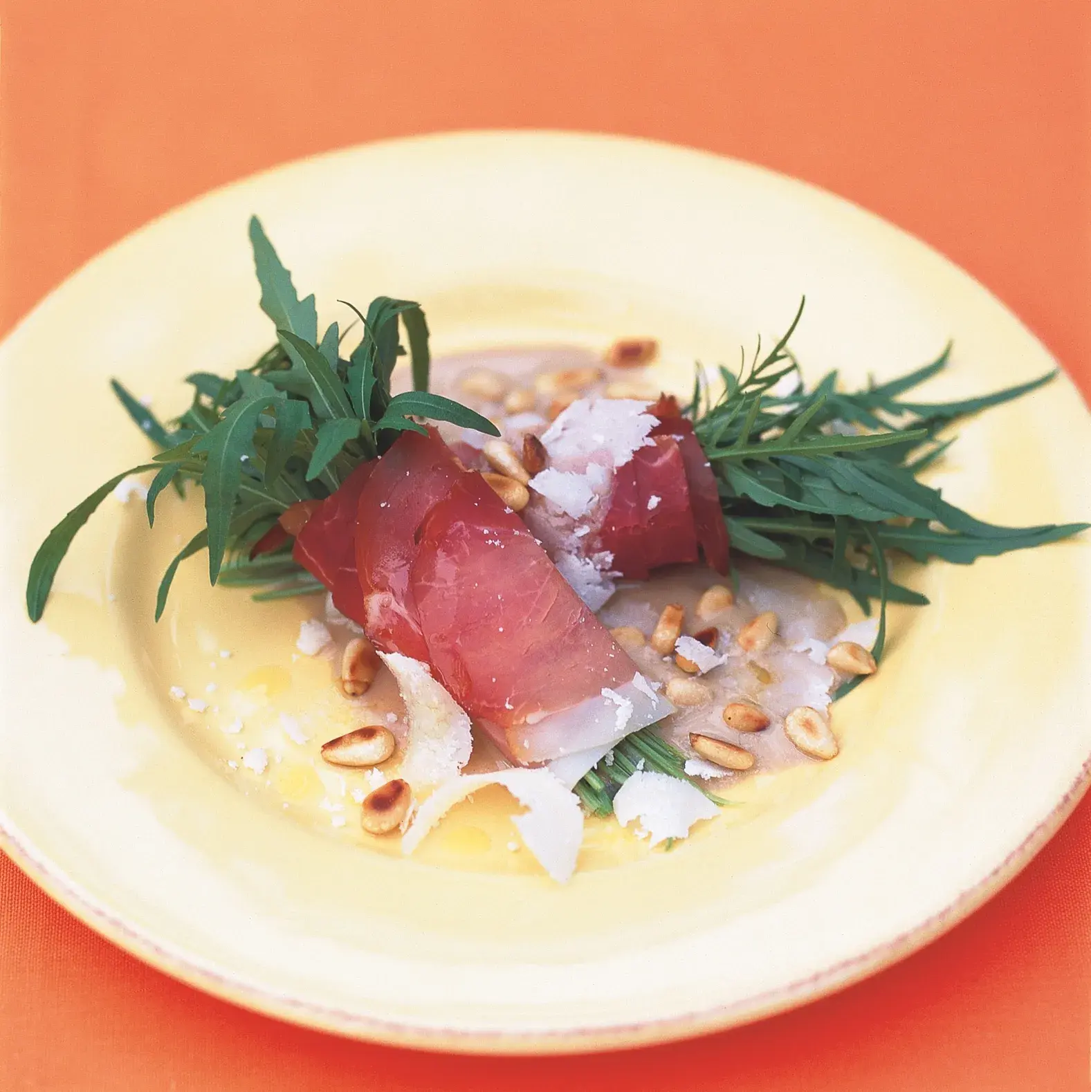 Jednoduchá, ale efektní lahůdka, v níž se předvede hned několik chutí a konzistencí – chuťově výrazná šunka je vláčná, rukola a piniové oříšky zase krásně křupou…