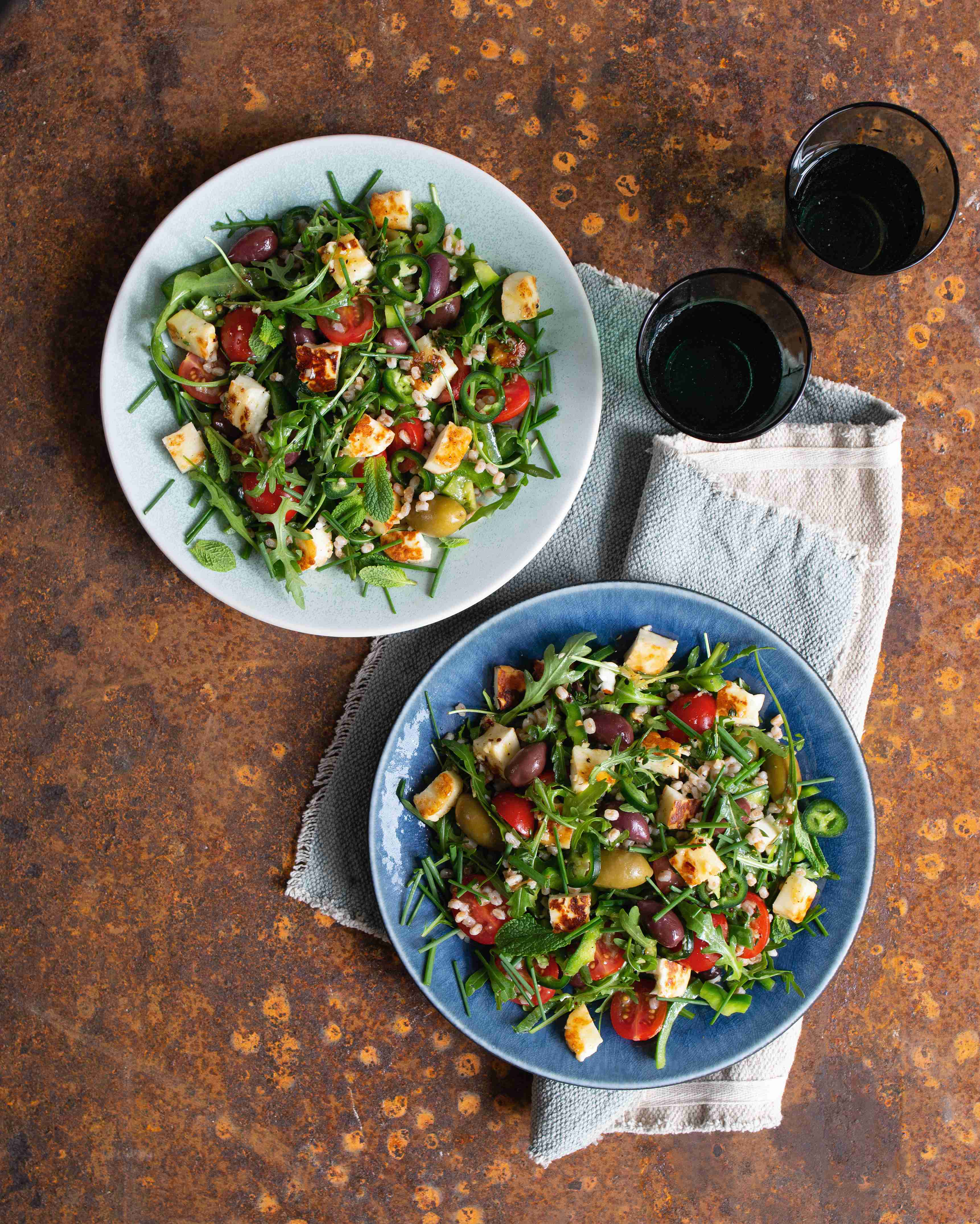Nám středomořská kombinace rukolového salátu s rajčaty a olivami, špaldovými kroupami a opečeným sýrem halloumi naprosto učaroval. Je zábavný, lehký i sytý a krásně barevný. Pokud se bojíte, že salát bude málo sytý, přidejte kroupy, luštěniny, rýži nebo perlový kuskus.
