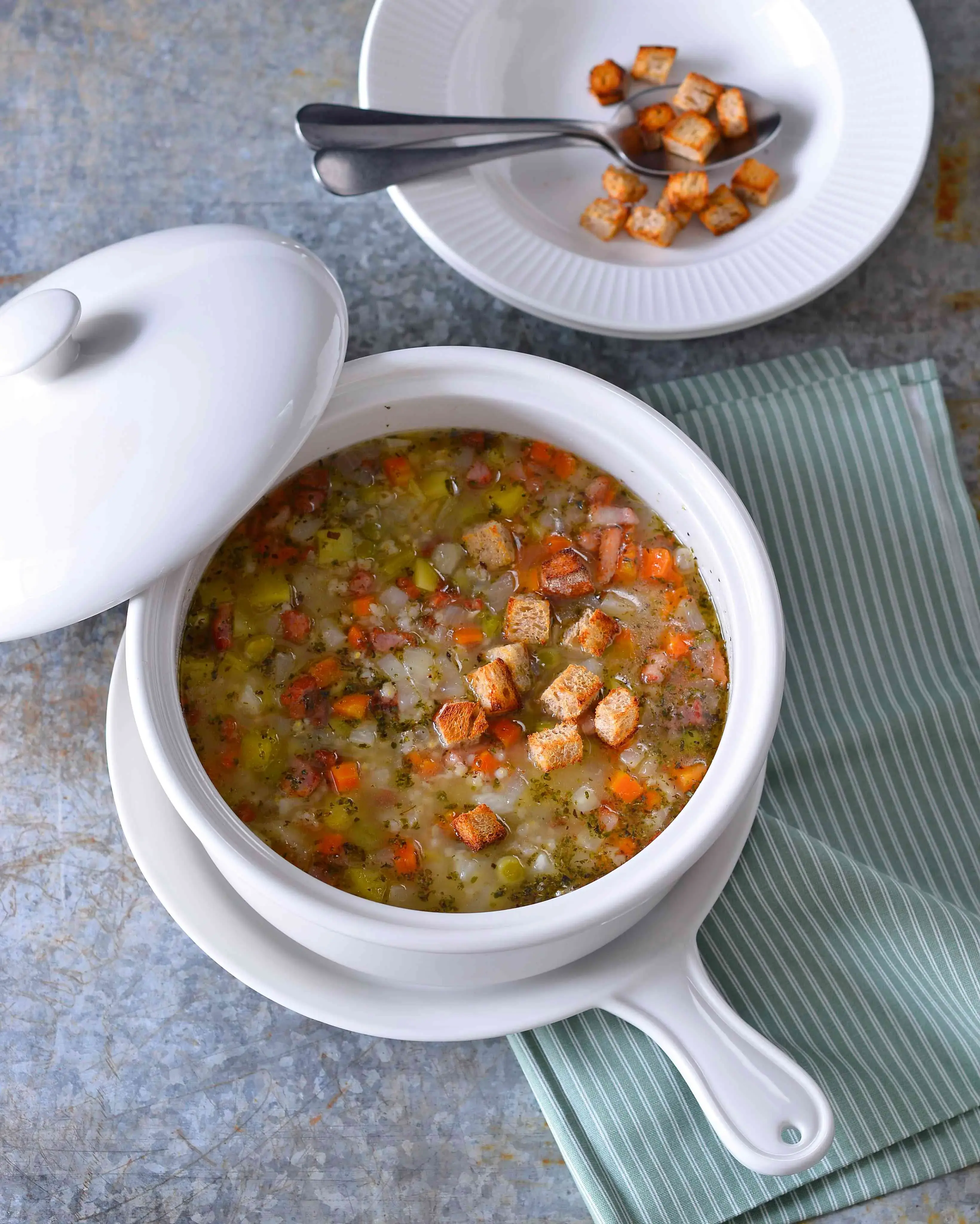Původní rumfordská polévka se připravovala v jednom kotli a smyslem jejího vaření bylo nasytit davy. Naše moderní verze ctí dnešní postup doporučovaný k vaření luštěnin a snaží se, abyste si na skromné polévce také pochutnali.