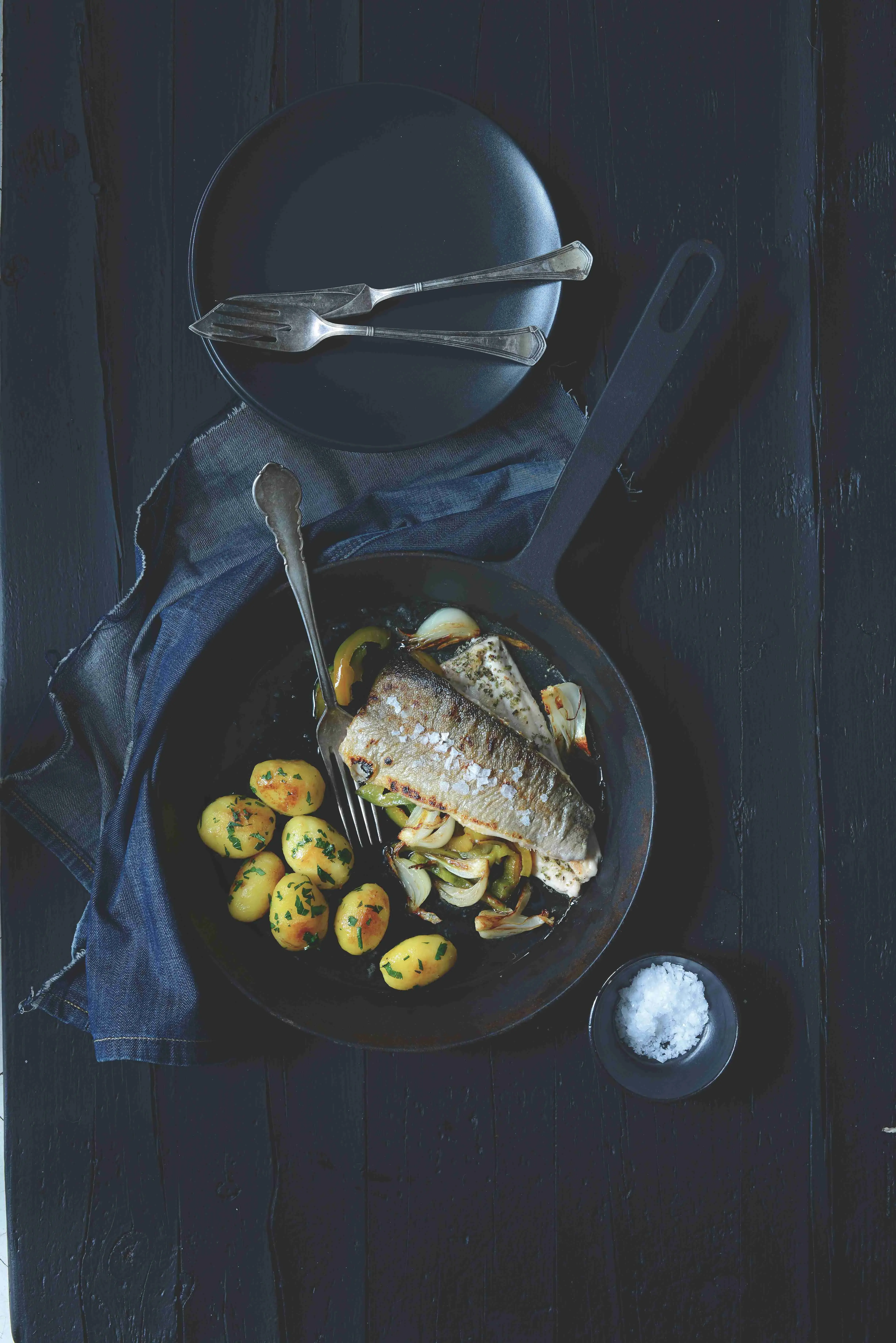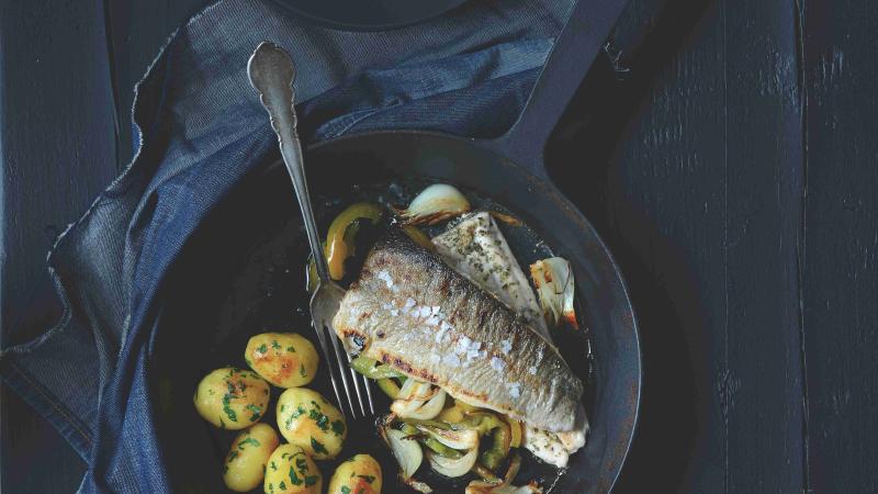 Jemné a křehké rybí maso a jejich výrazný doprovod v podobně cibule a paprik stačí doplnit opečenými brambůrky.