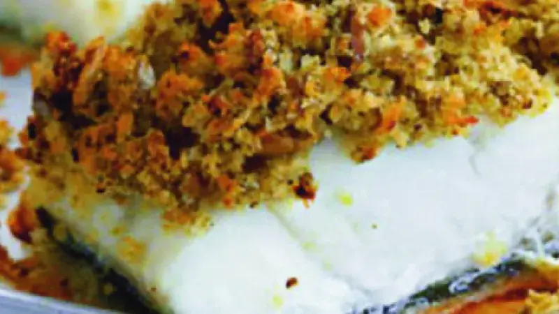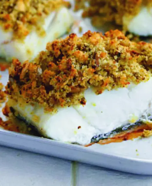 Křupavá směs pesta a olivového oleje je skvělá i na kuře nebo kotlety. Čerstvou strouhanku získáte nejrychleji, když rozmixujete pečivo v robotu.