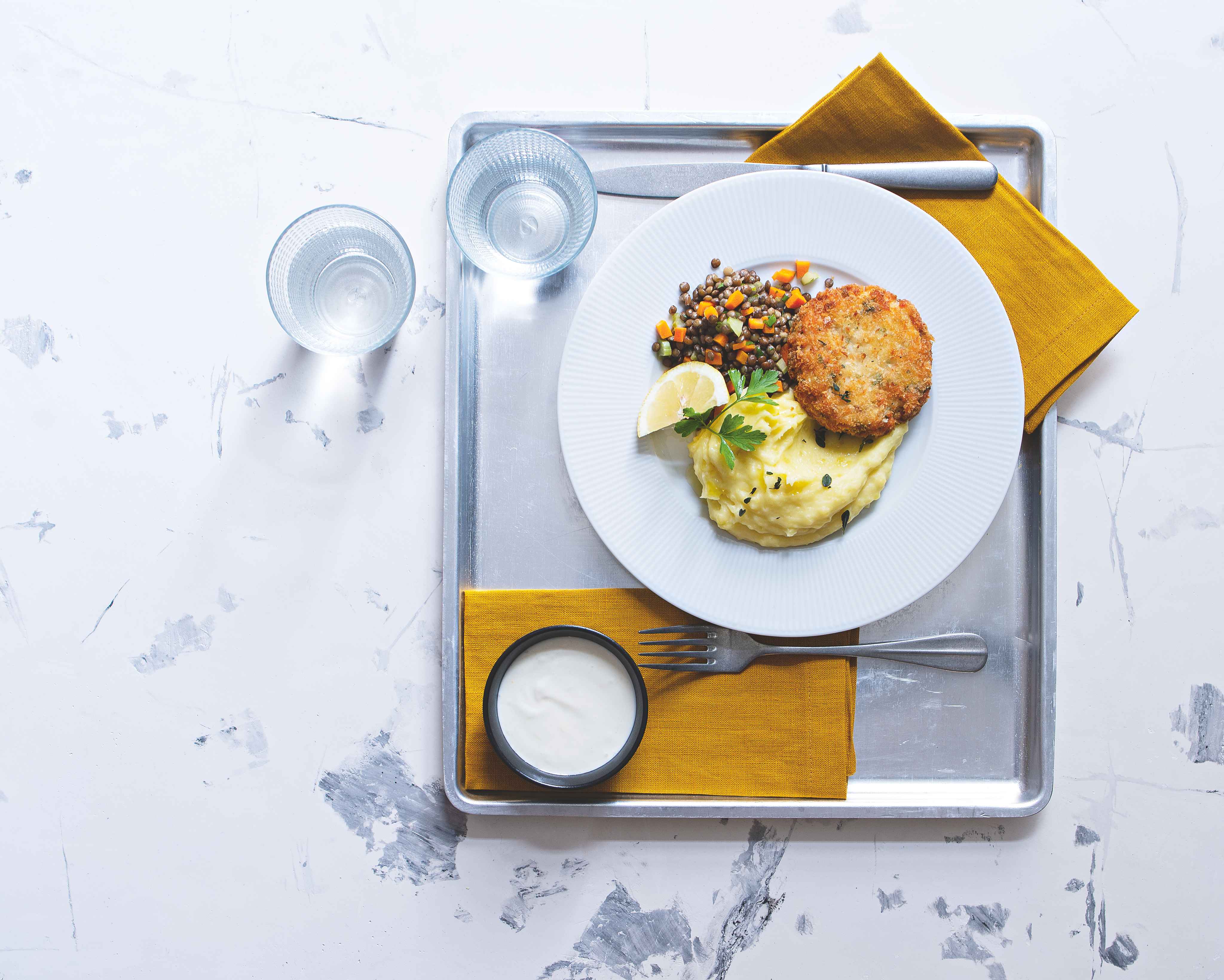 „Rybí karbanátek je ideální způsob, jak do dětí dostat ryby. Pokud chcete skvělou bramborovou kaši, 1/4 brambor nevařte, ale upečte na soli,“ radí šéfkuchař Zdeněk Křížek. Karbanátek a kaši jsme na pestrém talíři doplnili ještě čočkovým salátem a svěžím citronovým jogurtem.