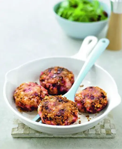 Šťouchané brambory s řepou, cibulkami a rybou jsou skvělé také neopečené. Místo ze zbylých brambor je připravte z čerstvě uvařených.
