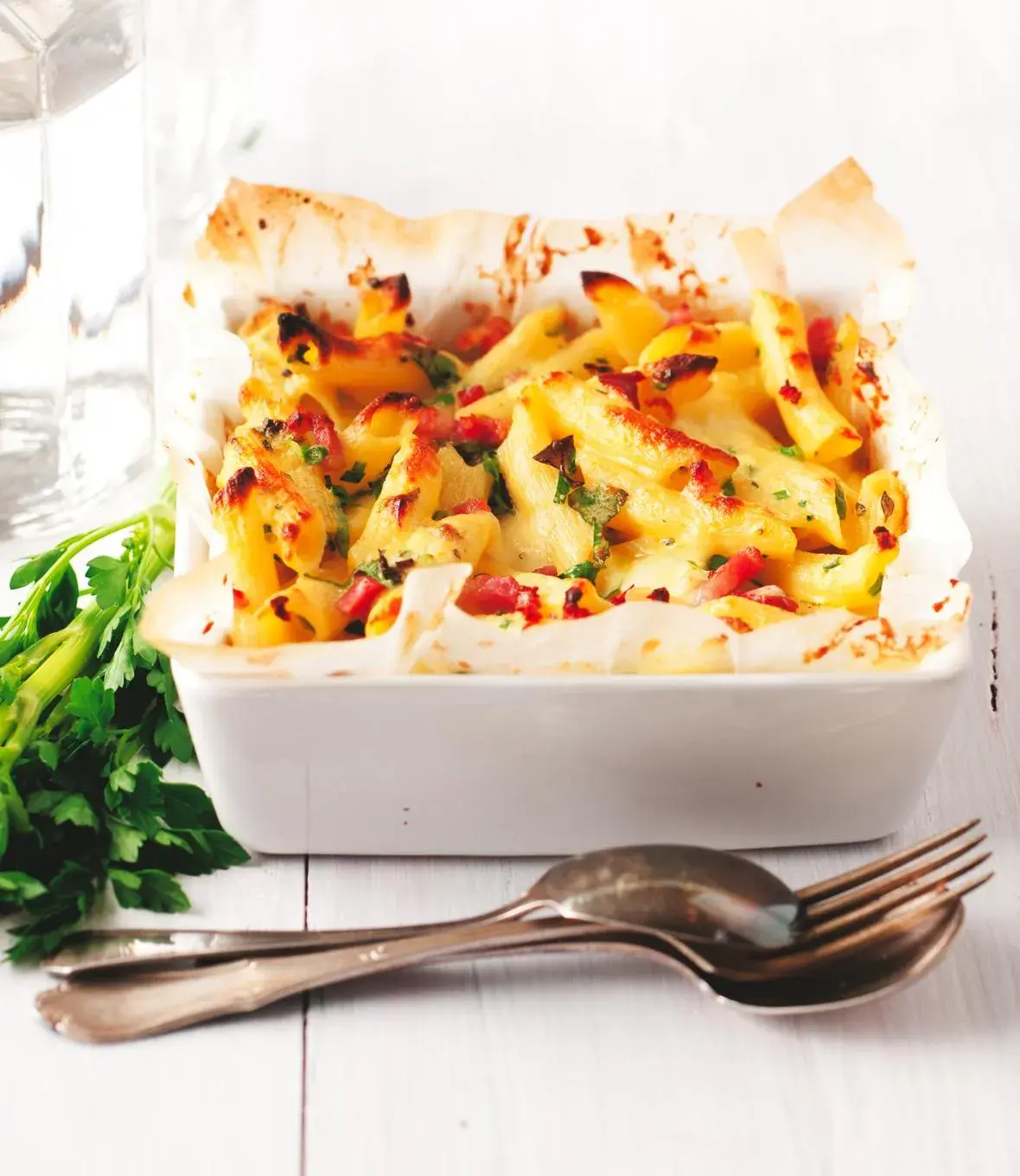 Rychlé zapečené těstoviny jsou dobrota z jednoho pekáče, kterou se zavděčíte všem. Pokud přemýšlíte, co udělat z těstovin, pak zapečené těstoviny se šunkou, jsou téměř sázka na jistotu. A jestli dáváte přednost variantě bez masa, pak šunku vynechejte, nebo ji nahraďte žampiony či kostičky tofu.