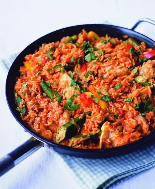 Ostré a průrazné rizoto patří k nejoblíbenějším africkým jídlům a je známé jako ,rýže Jolloff‘. Jeho kořeněný základ se hodí i do polévek a omáček.