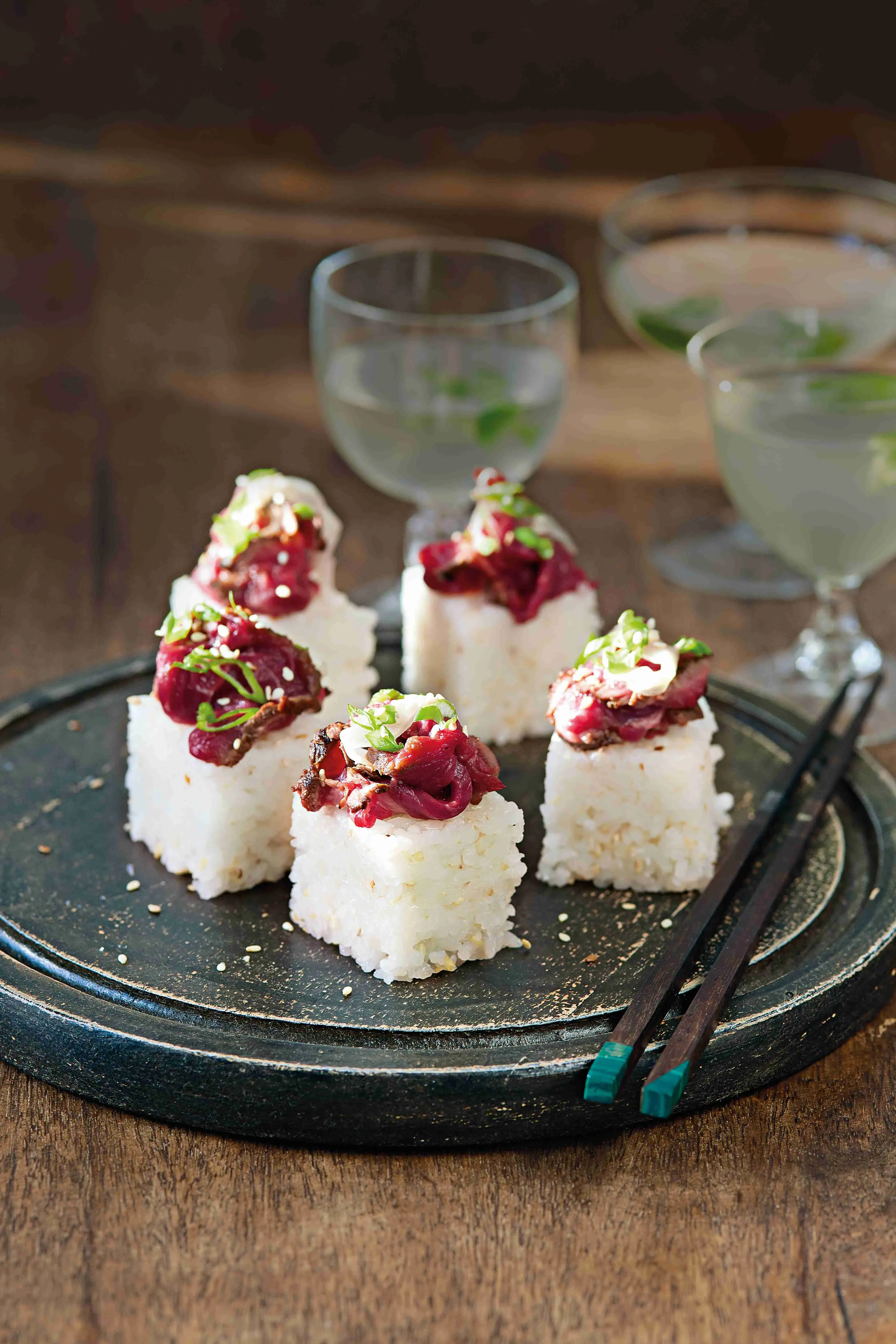 Kostky z rýže ochucené podobně jako suši zaujmou neobvyklým tvarem. S pikantně ochuceným hovězím masem připraveným ve stylu rostbífu se překvapivě dobře doplňují. Pastu miso, víno mirin i rýžový ocet seženete v obchodech s asijskými specialitami.