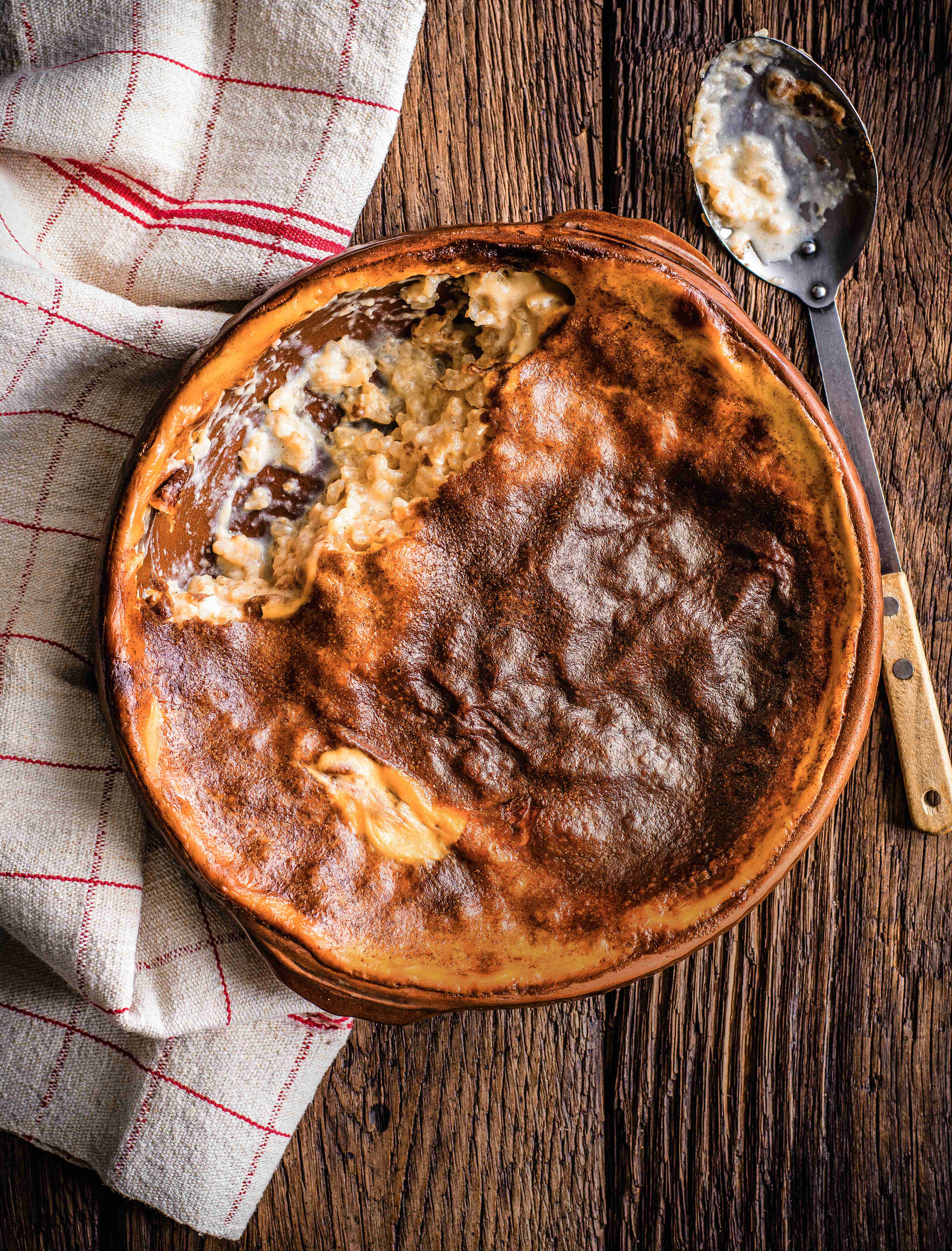 Normandský rýžový pudink se nejčastěji podává v nízkých kameninových miskách. Můžete jej upéct jako jeden velký dezert, ale i rozdělit do jednoporcovek. Je skvělý ještě teplý i zcela vychladlý, třeba s podušenými jablky nebo jablečným pyré.